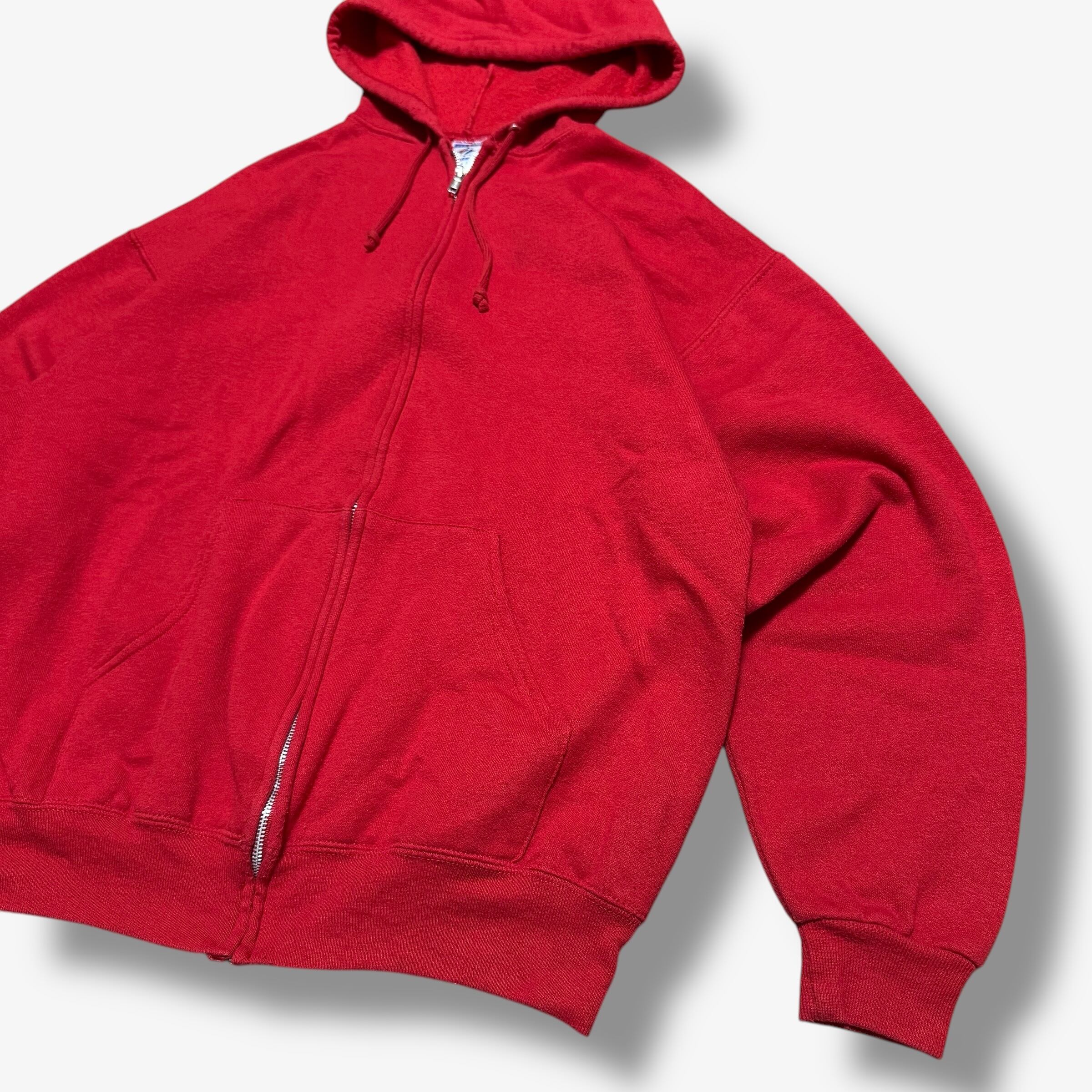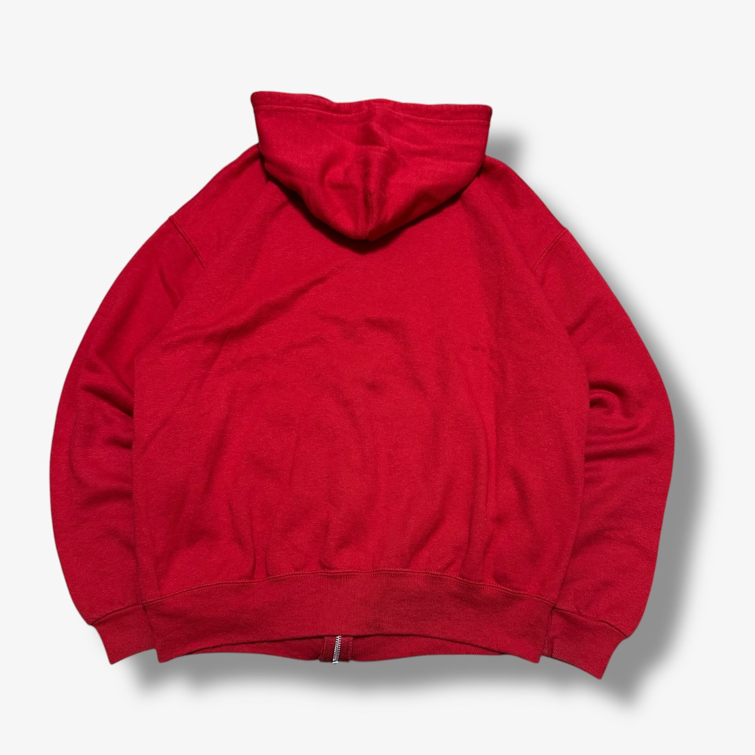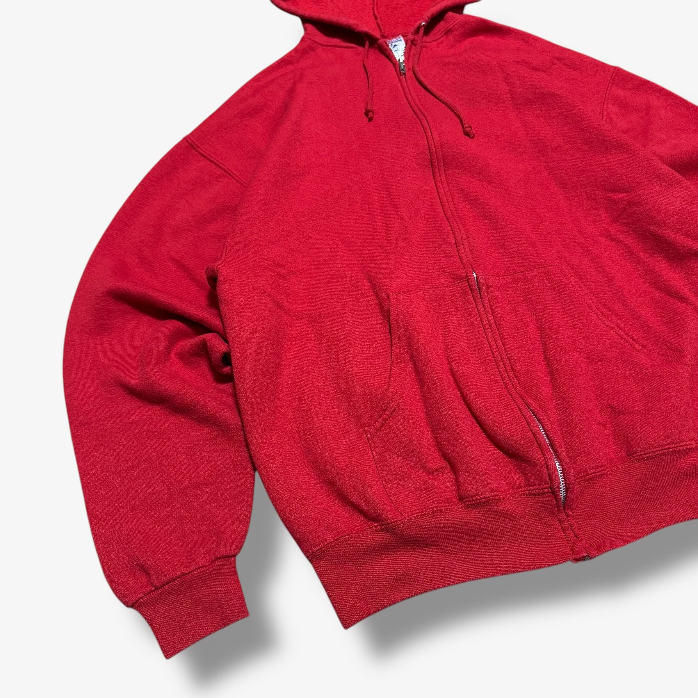 デニムとの相性抜群、赤のジャージーズアルミジップパーカー。00年代になるので、肩幅身幅はしっかり広く短丈の合わせやすいトレンド感のあるシルエットです。