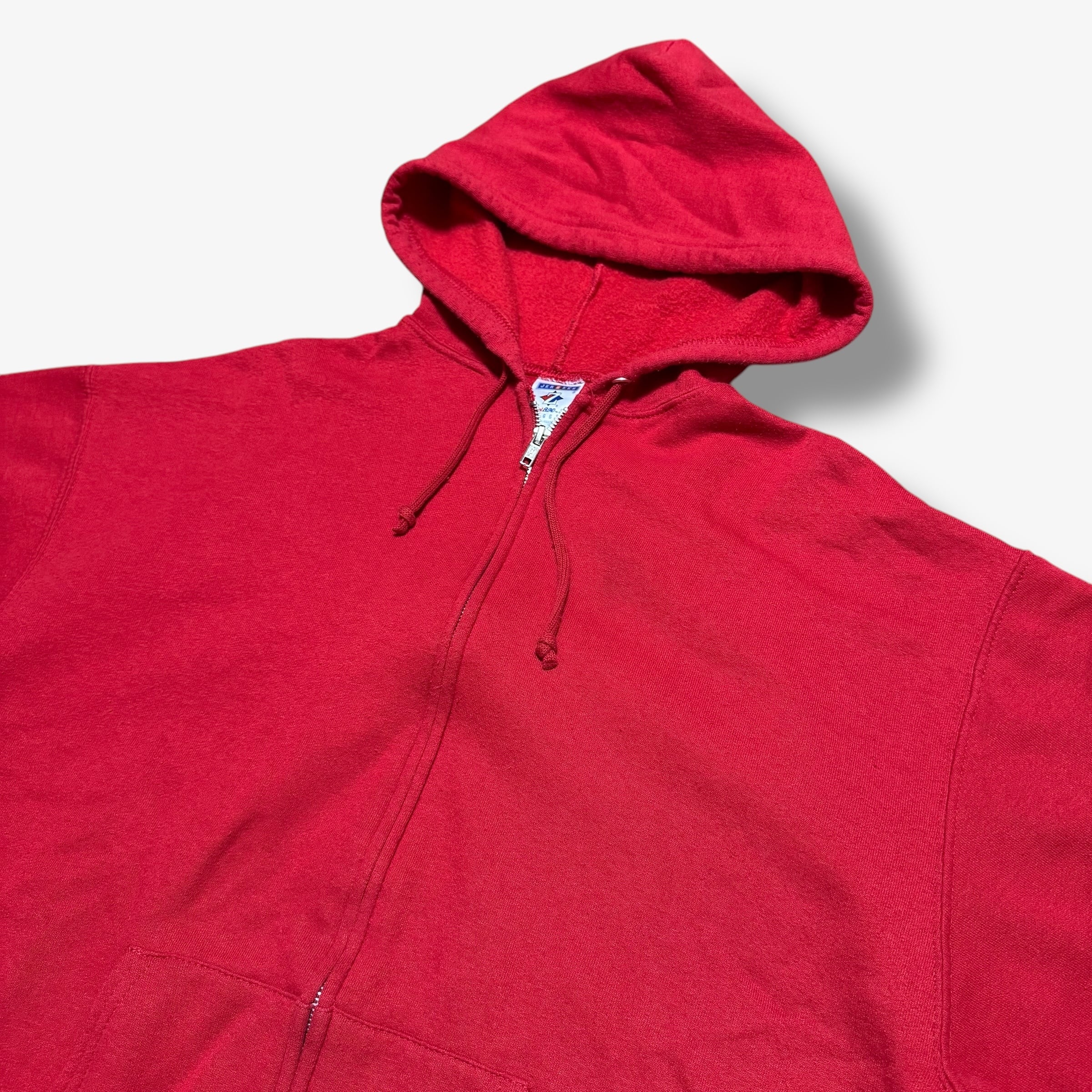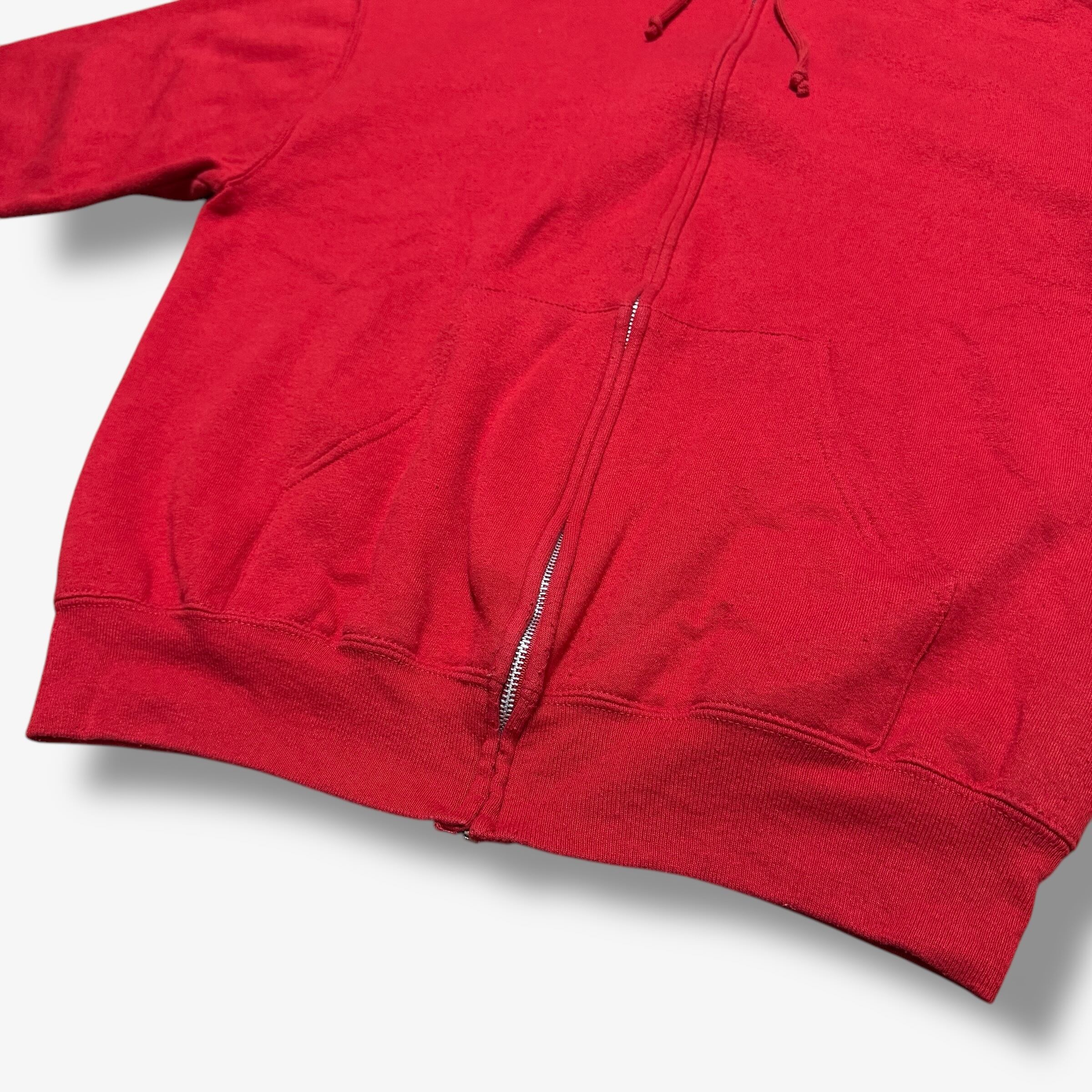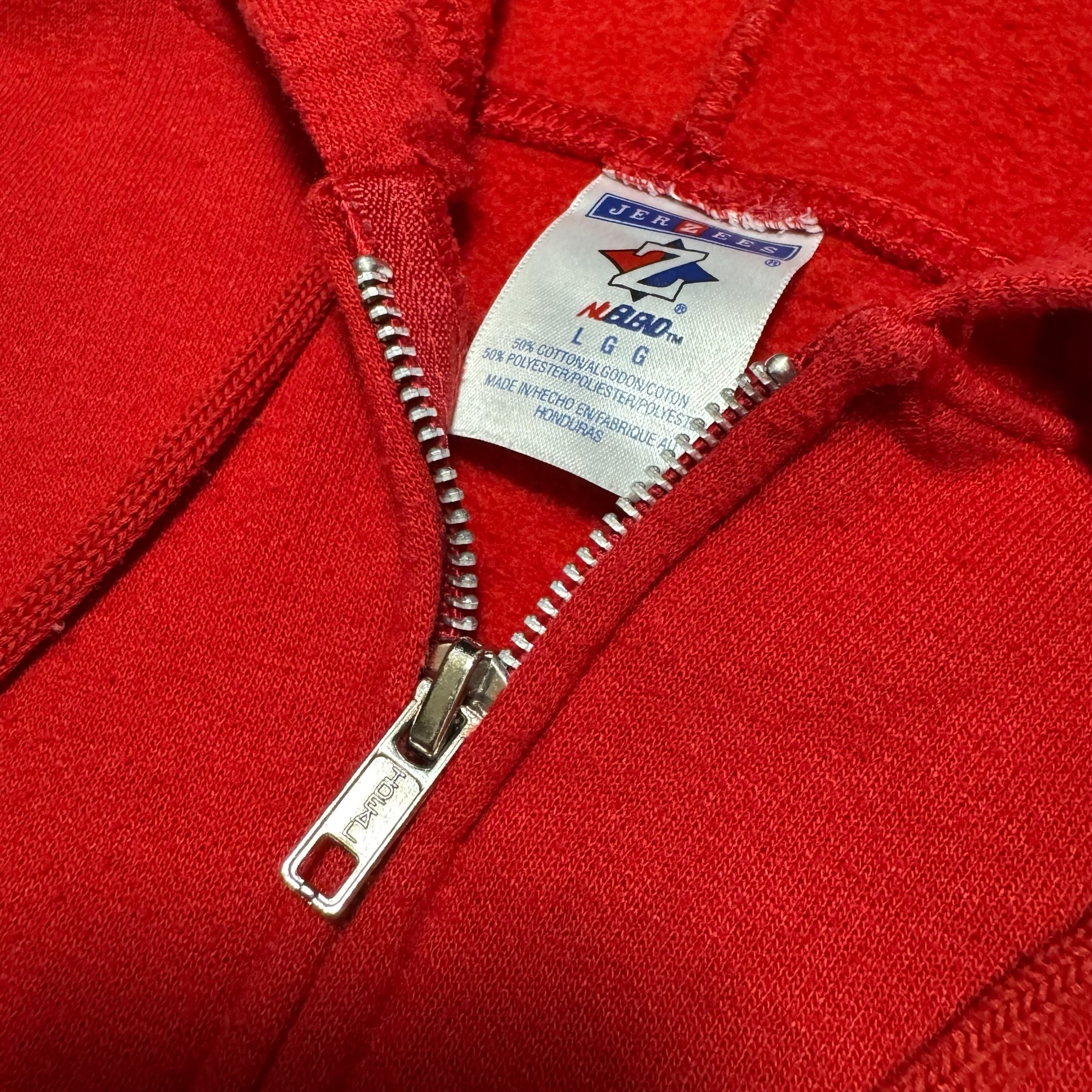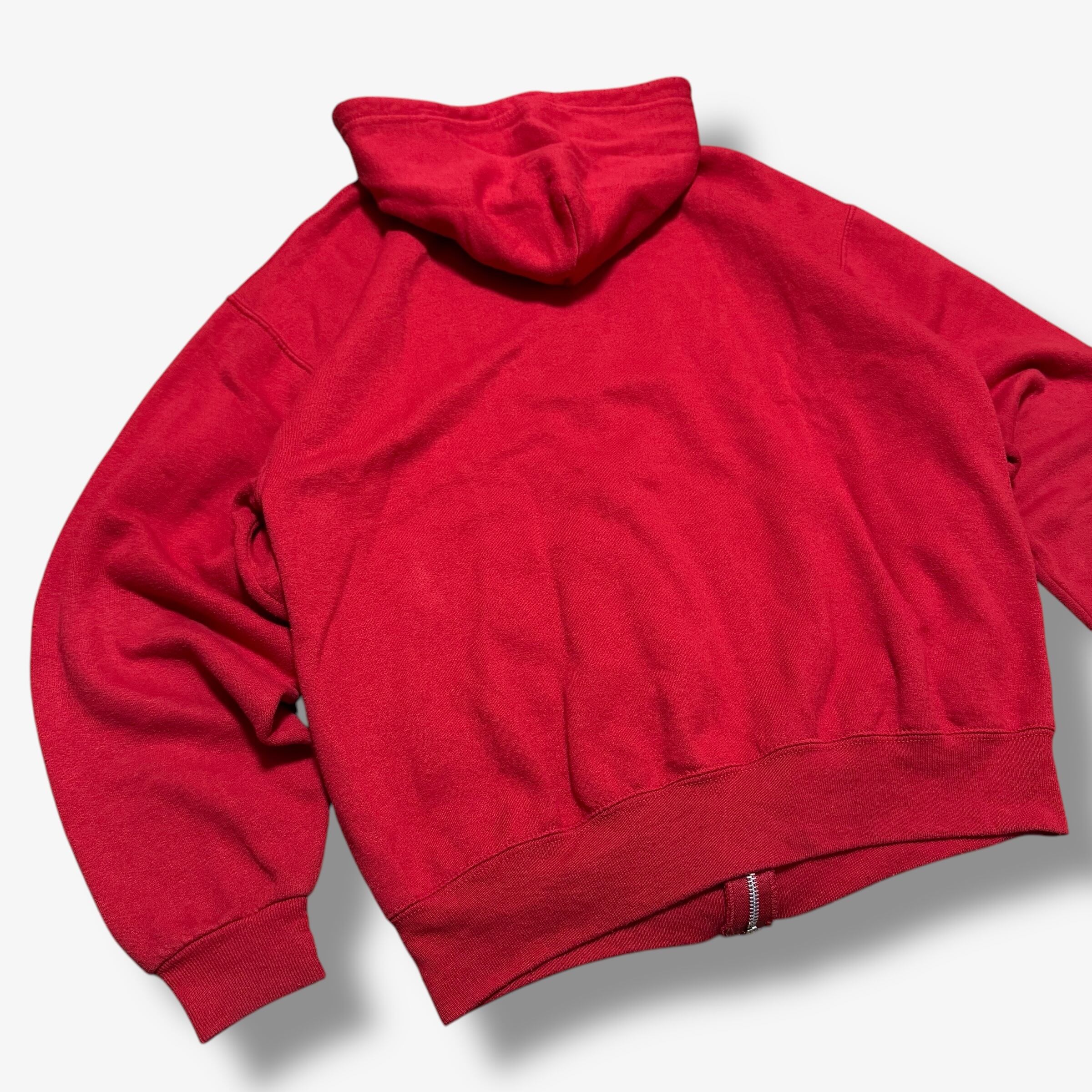 デニムとの相性抜群、赤のジャージーズアルミジップパーカー。00年代になるので、肩幅身幅はしっかり広く短丈の合わせやすいトレンド感のあるシルエットです。