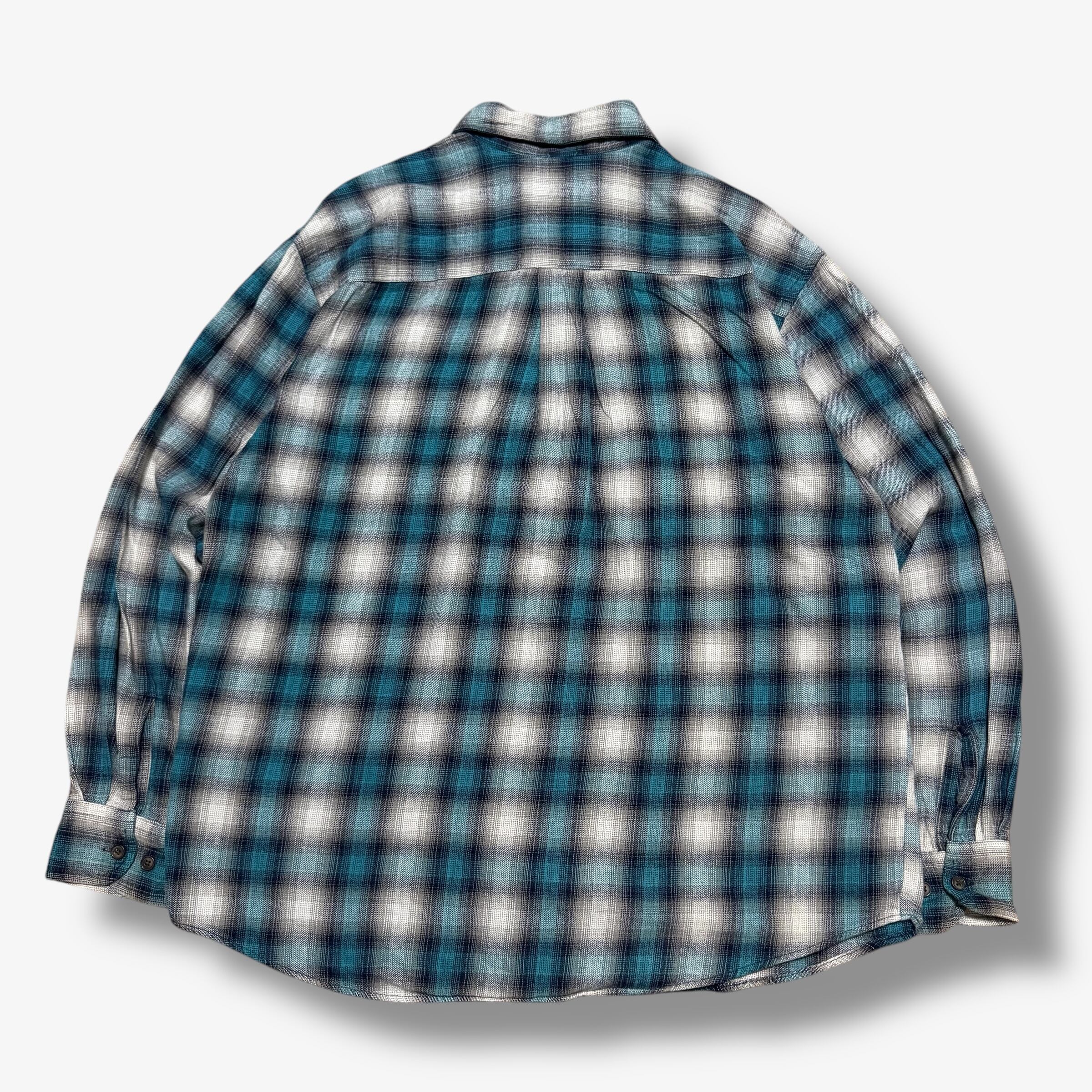 シーグリーン×黒×グレーのグッドカラーのシャドーチェック。肩幅身幅がしっかり広く着丈が短いのでシルエットバランスが最高の一枚です。