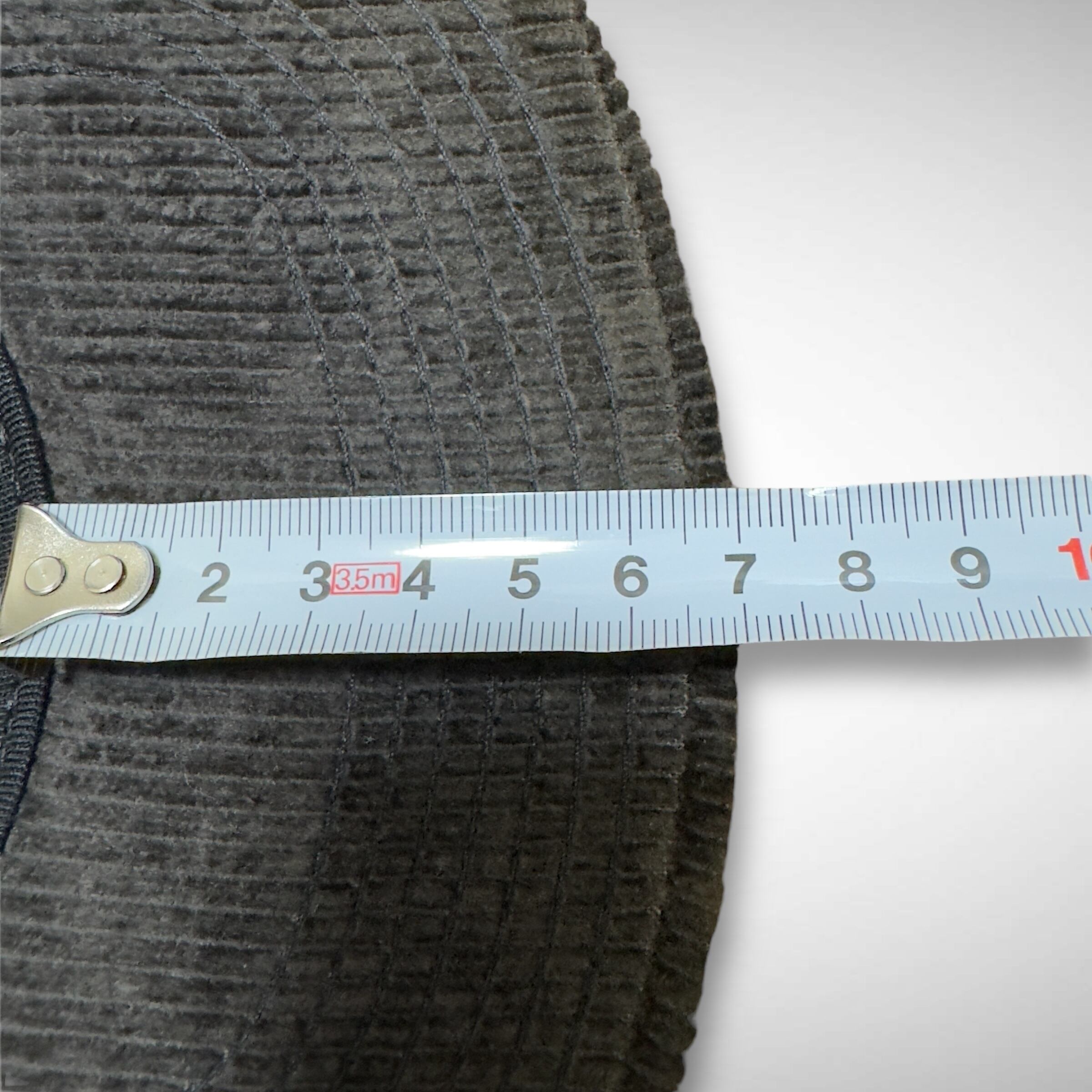 ブラック(光のあたり方ではグレーブラウンのようにもみえる)コーデュロイ素材に、大きく立体的に刺繍されたブランドロゴがはいります