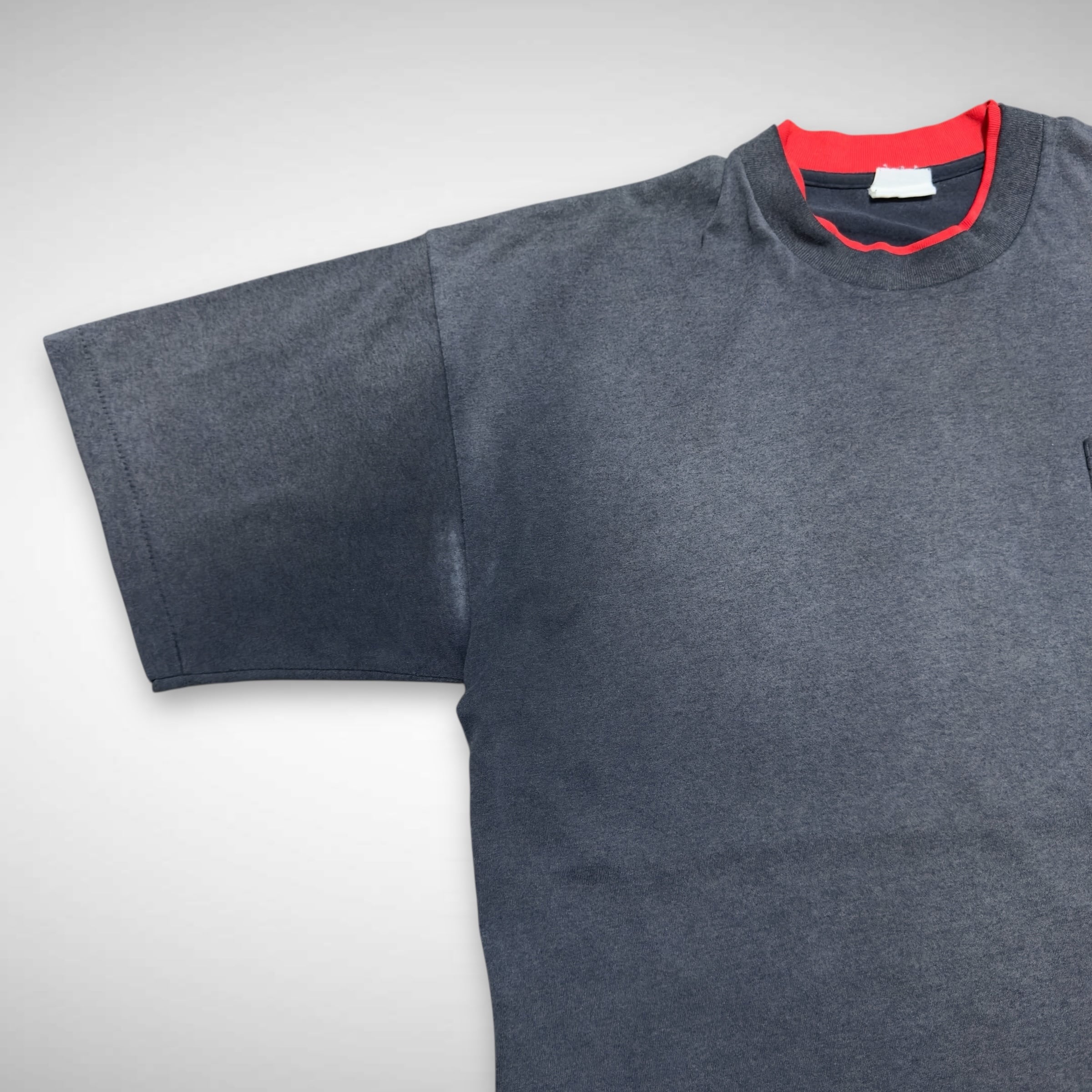 ボディはUSA製American Prideのシングルステッチで、ブラックカラーが経年変化で絶妙な色に褪色。首元にはチームカラーである赤のリブがレイヤードされたデザインです。