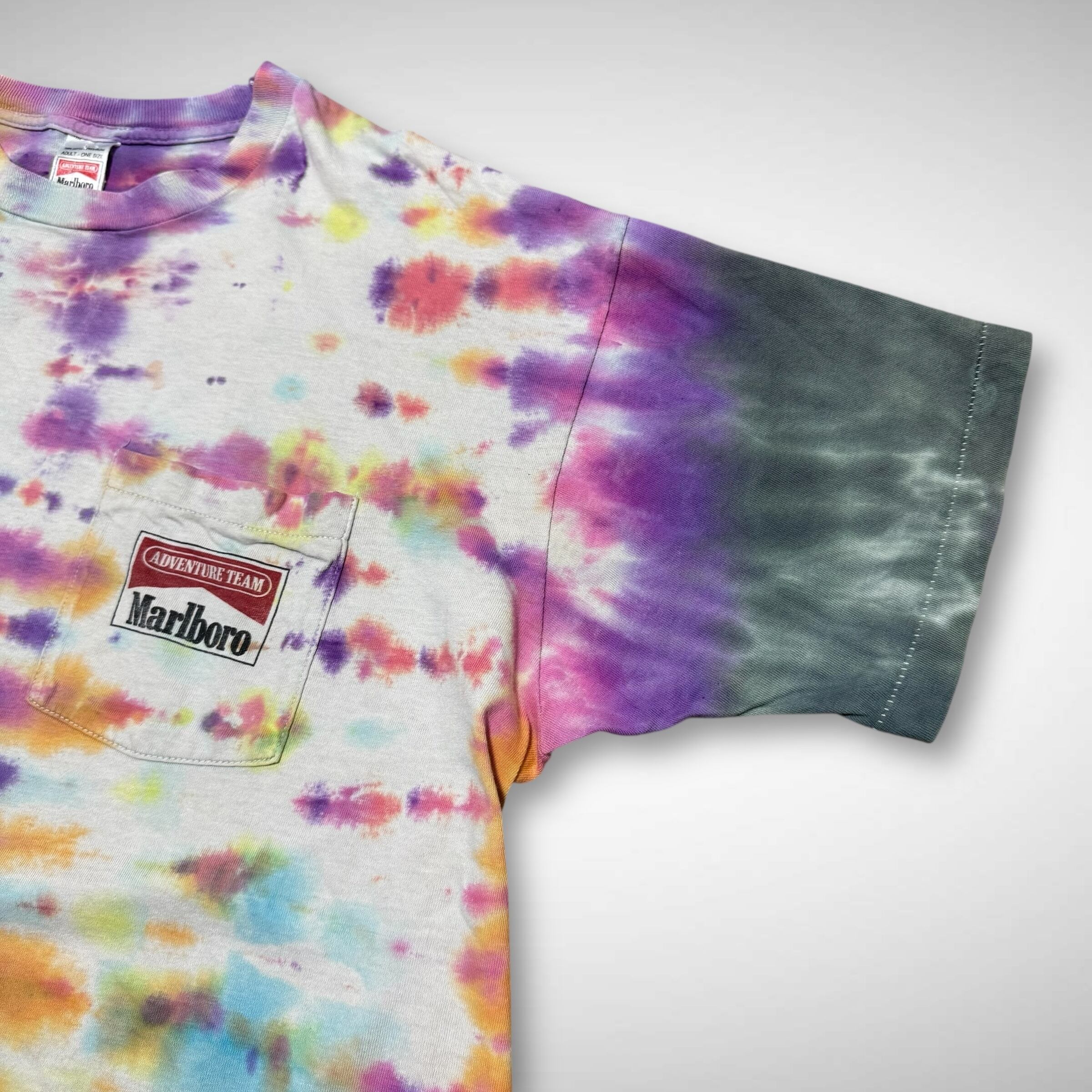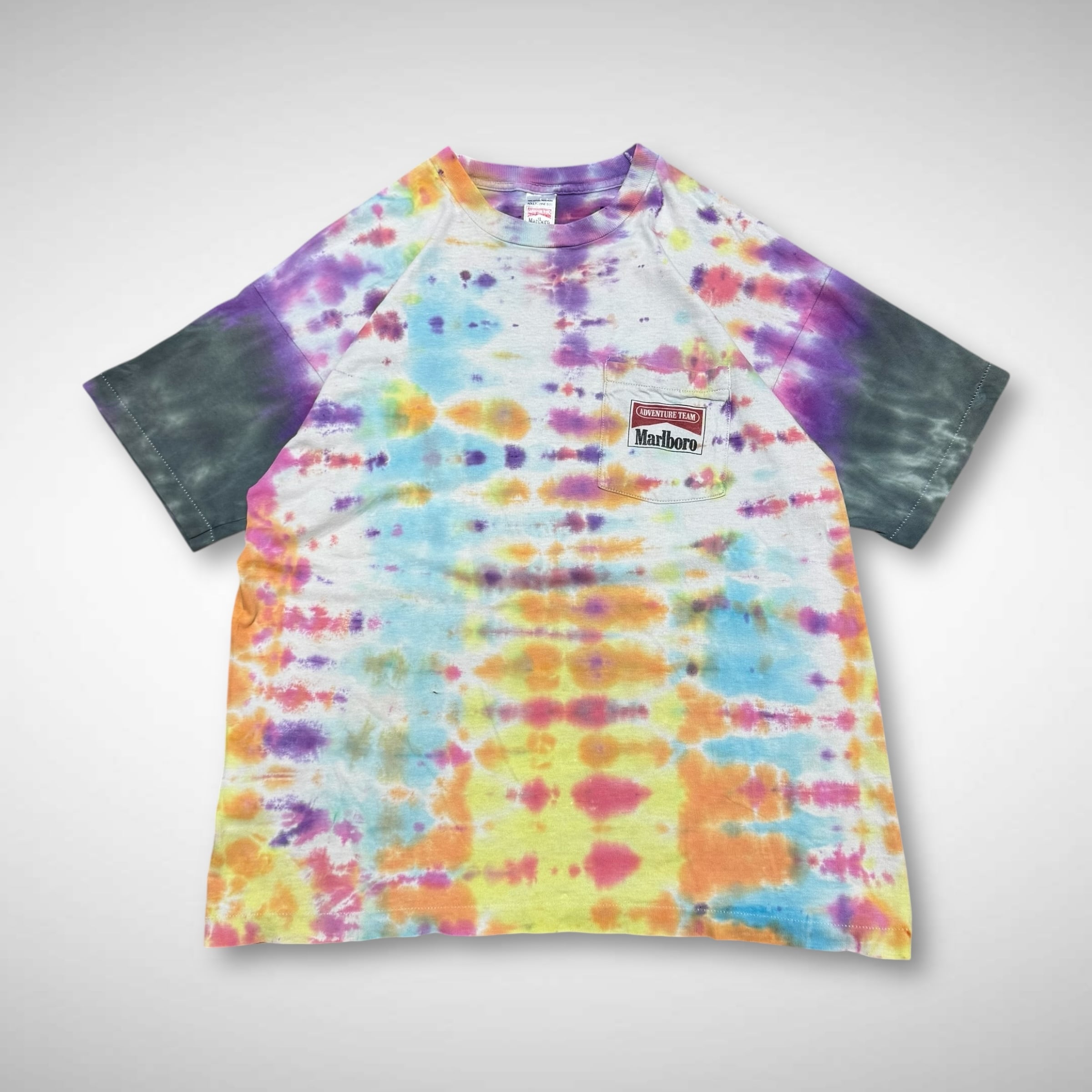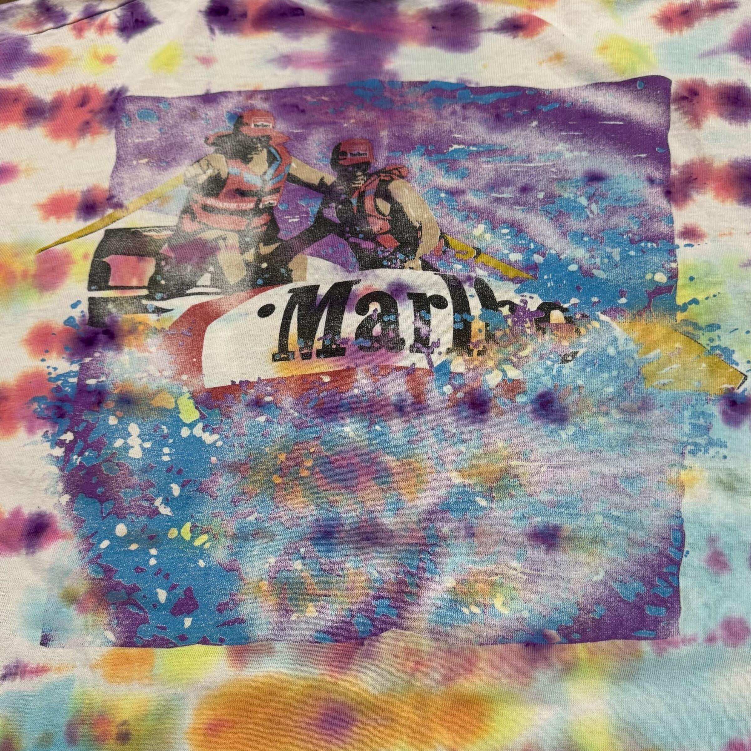 フロントのポケットにはマルボロのロゴプリント。バックにはボートにのる二人のグラフィックが入り水しぶきとタイダイの柄が絶妙にマッチしたデザイン