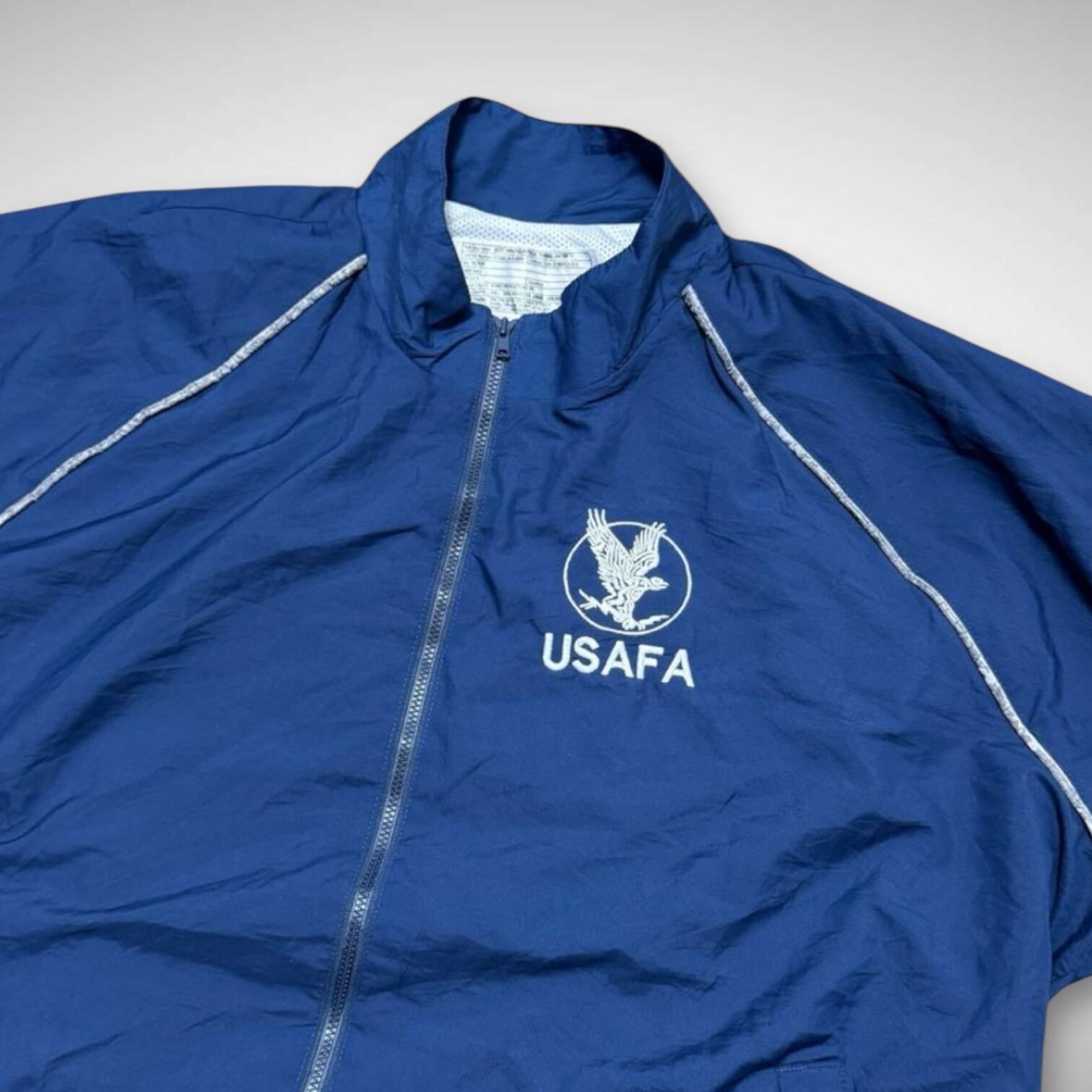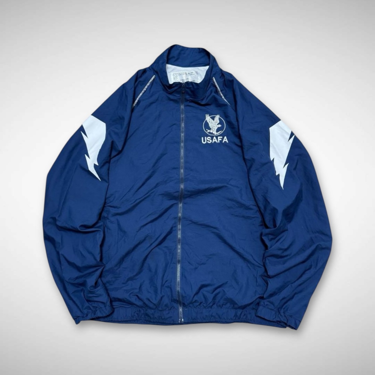 アメリカ空軍のエアフォース(u.s.airforce)のトレーニングジャケットとは違い、アメリカ空軍士官学校の校章が胸元に、両袖にサンダーのプリントが入る空軍士官候補生用のジャケットになります