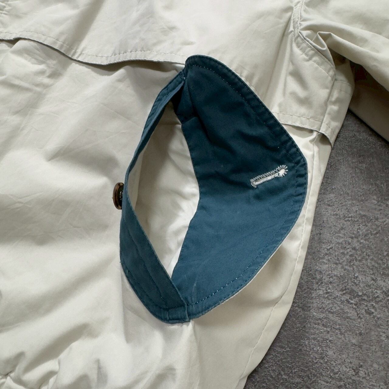 襟の二重比翼、ダブルポケット、チンストラップ、裏地のストライプ、ボタン、シルエットなどなど、高いデザインのディテール施されています