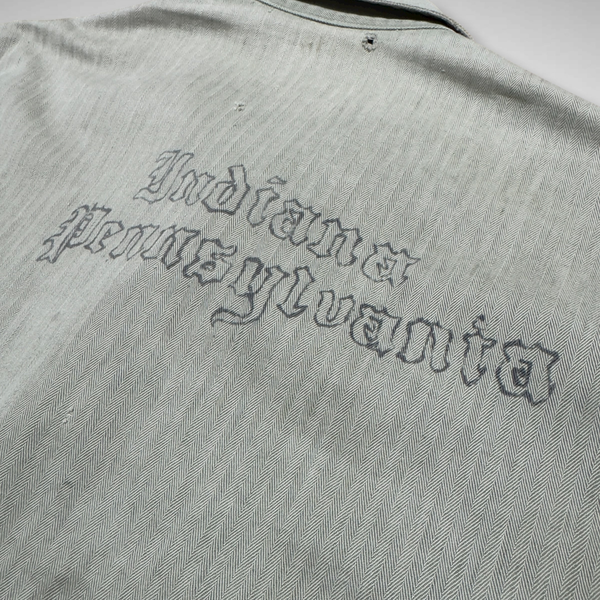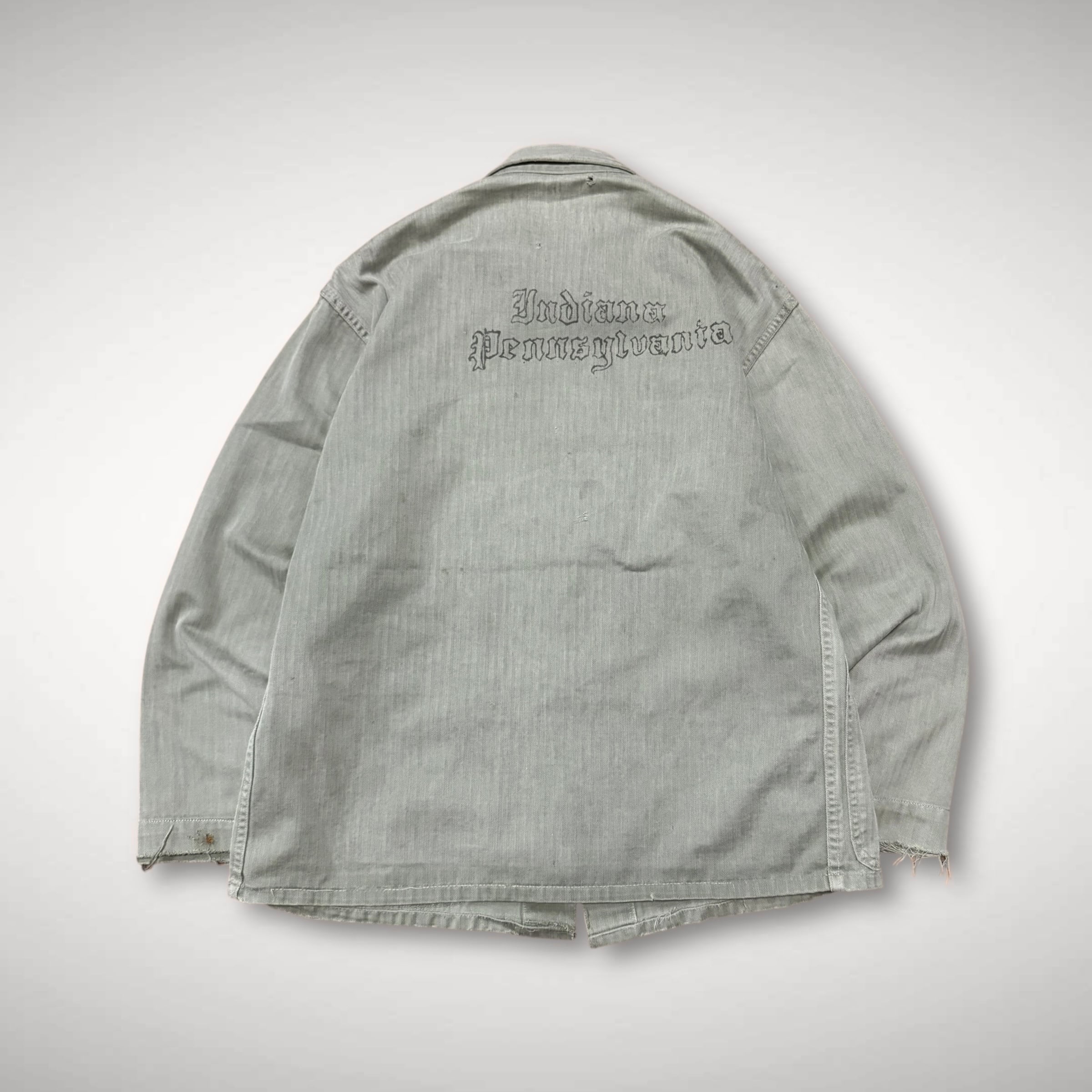 背面にオールドイングリッシュで入る落書きがクールな一枚。ゴリゴリのビンテージミリタリーながら、どこかスケートライクな横ノリの匂いも感じる個体です