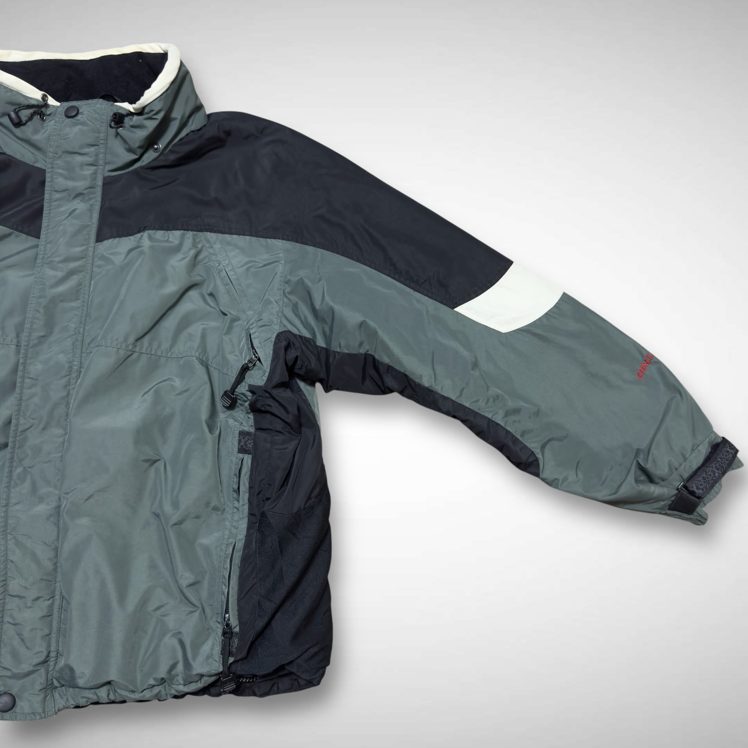 ブラック×オリーブにホワイトの切替が映える配色で、フロントと袖には「CHALLENGE」ロゴ刺繍入ります