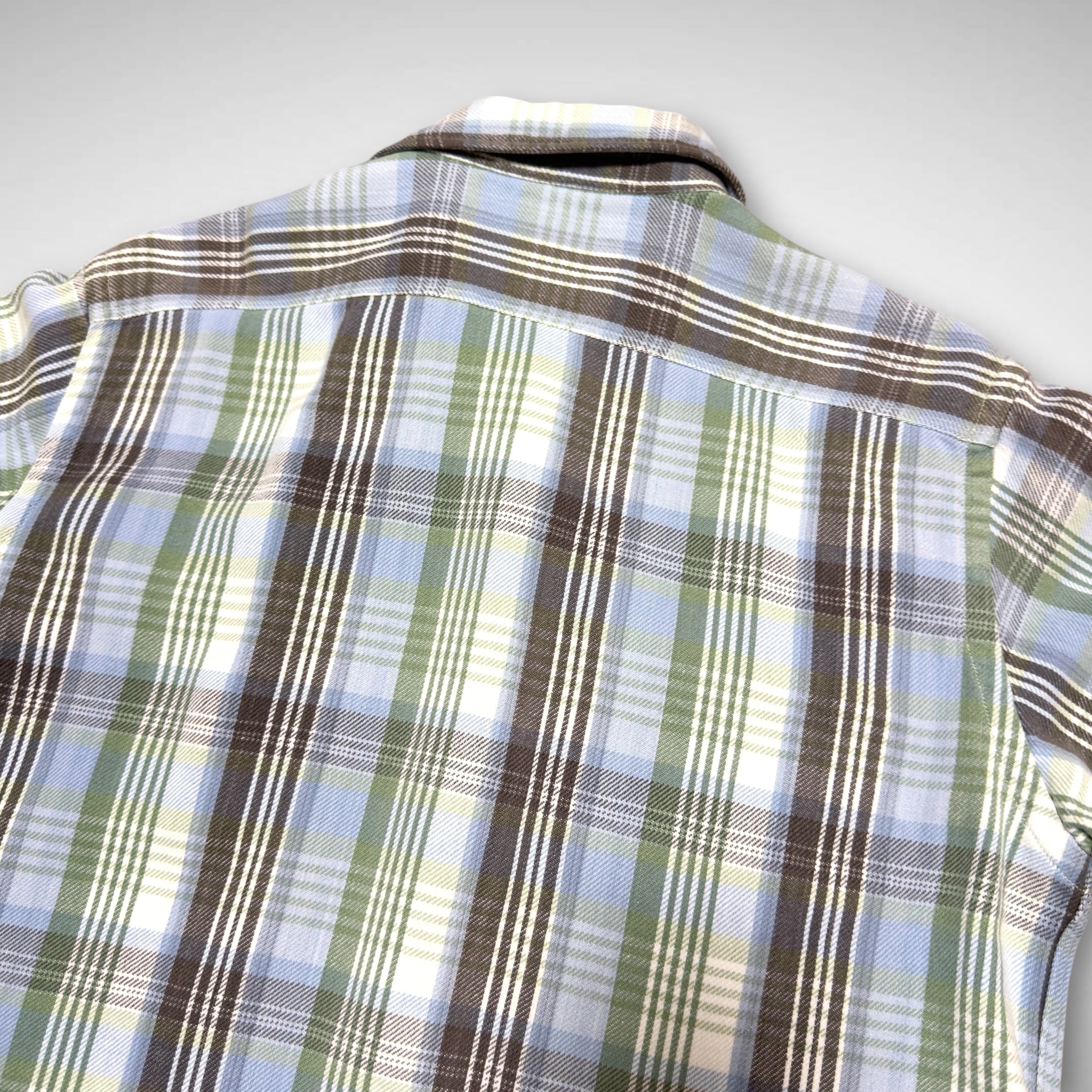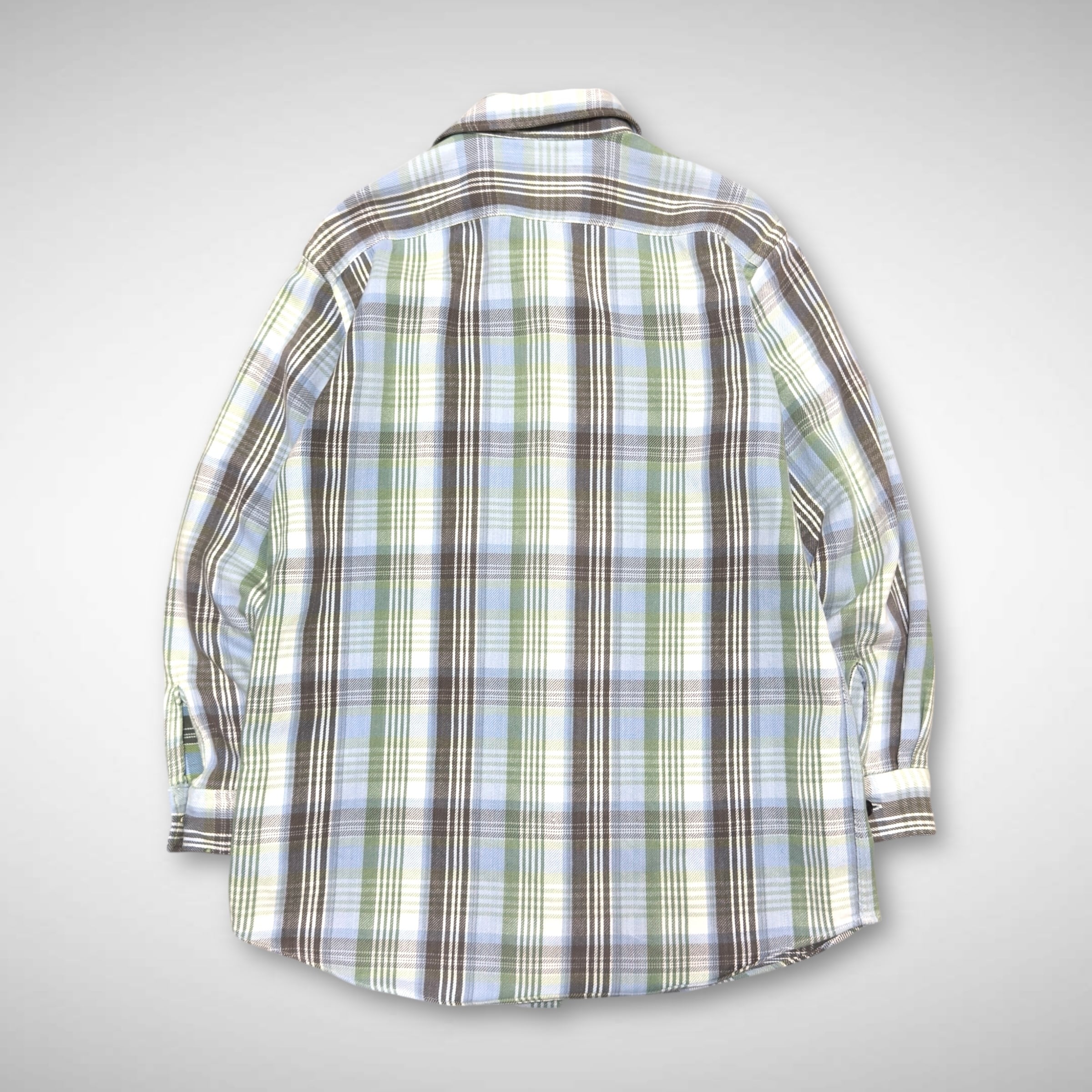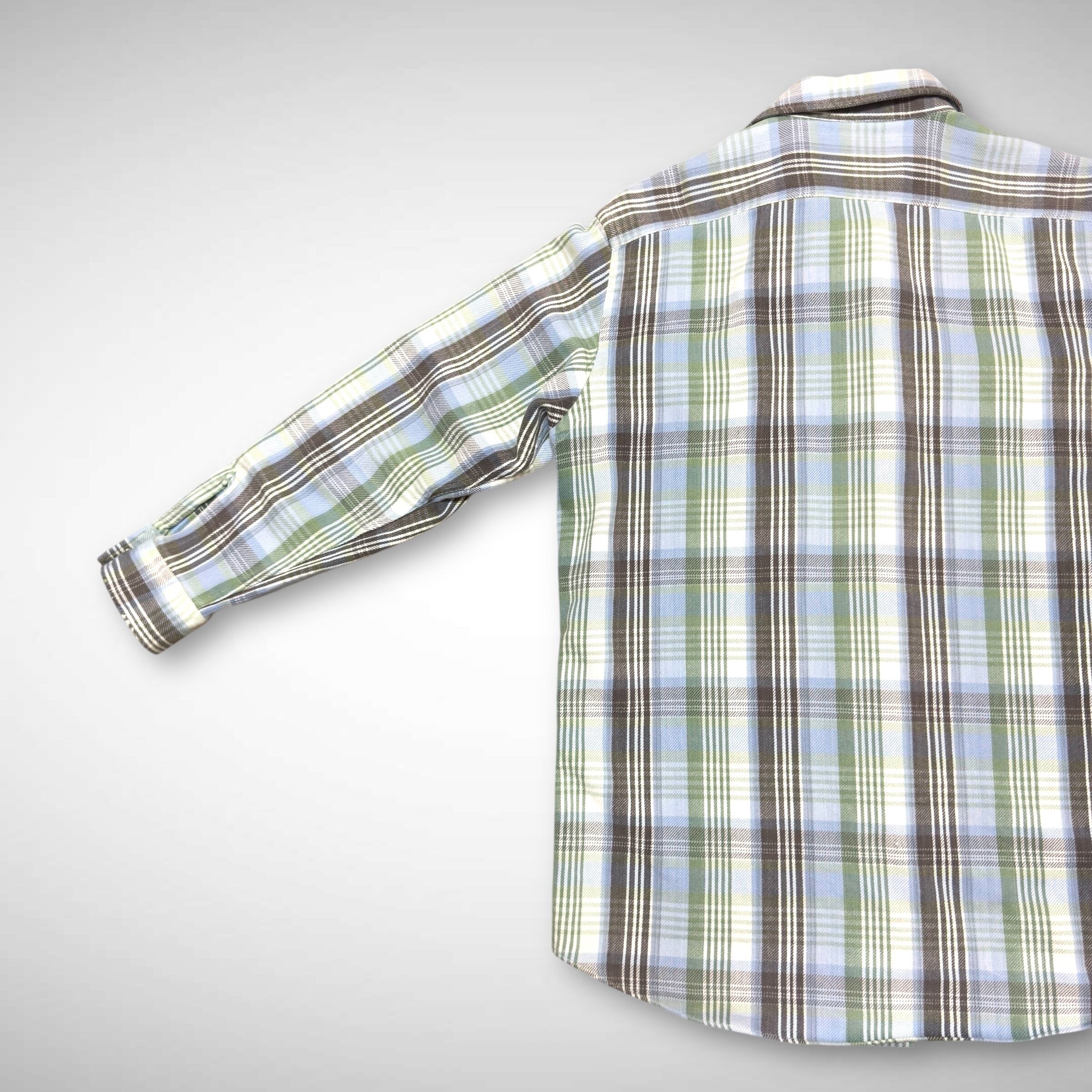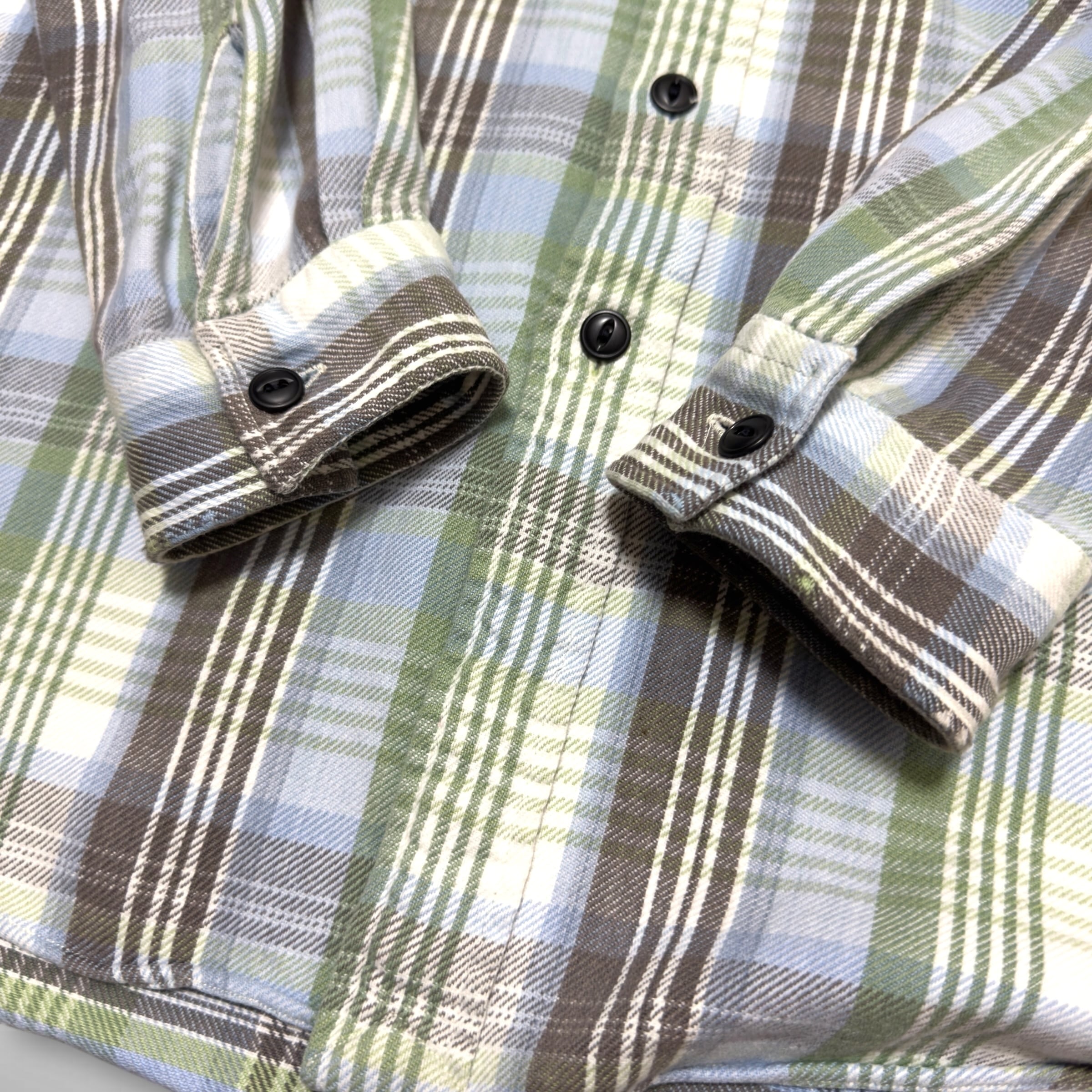 ライムグリーンをベースに、ライトブルー、ペールブラウンなどで構成された淡いくすみカラーのヘビーネル