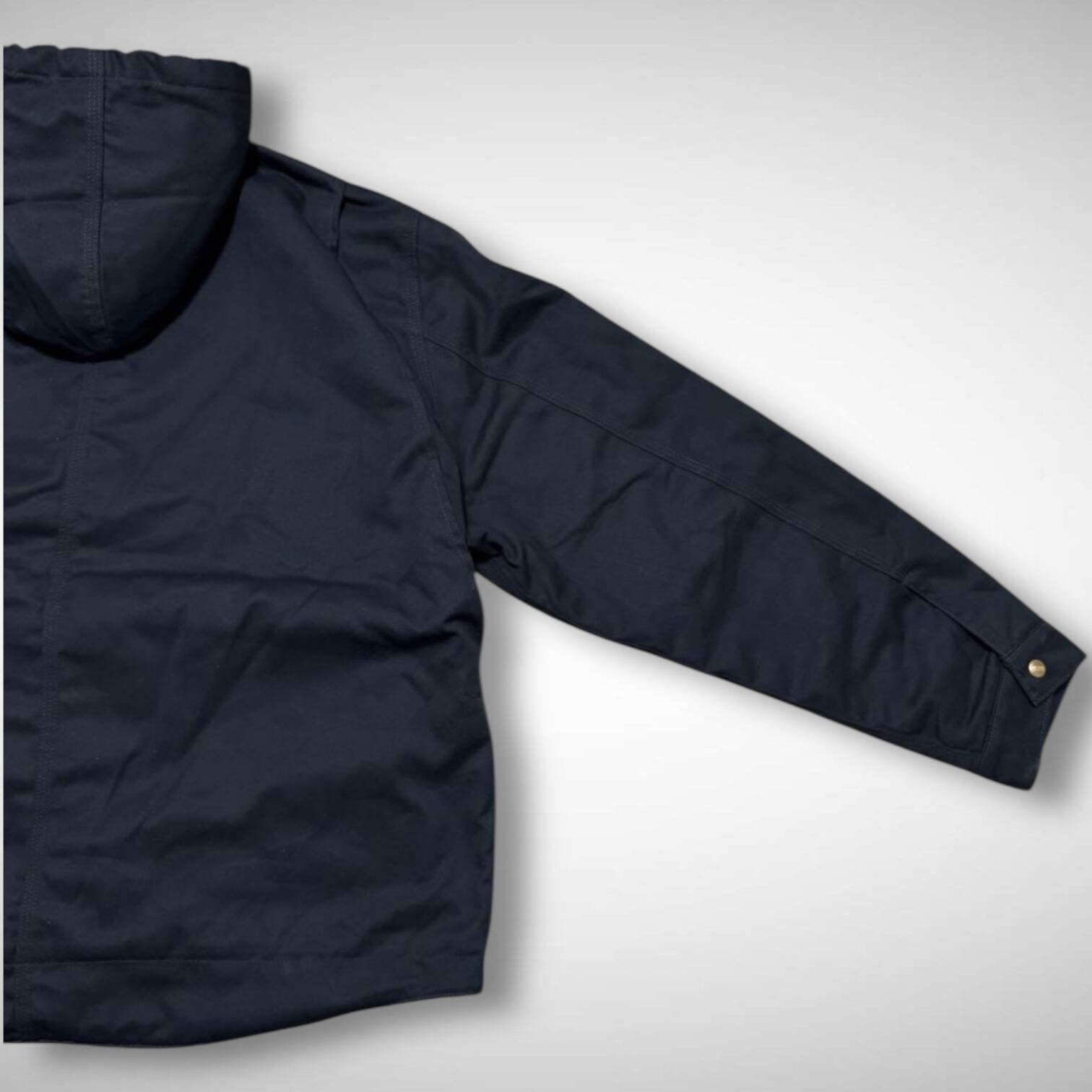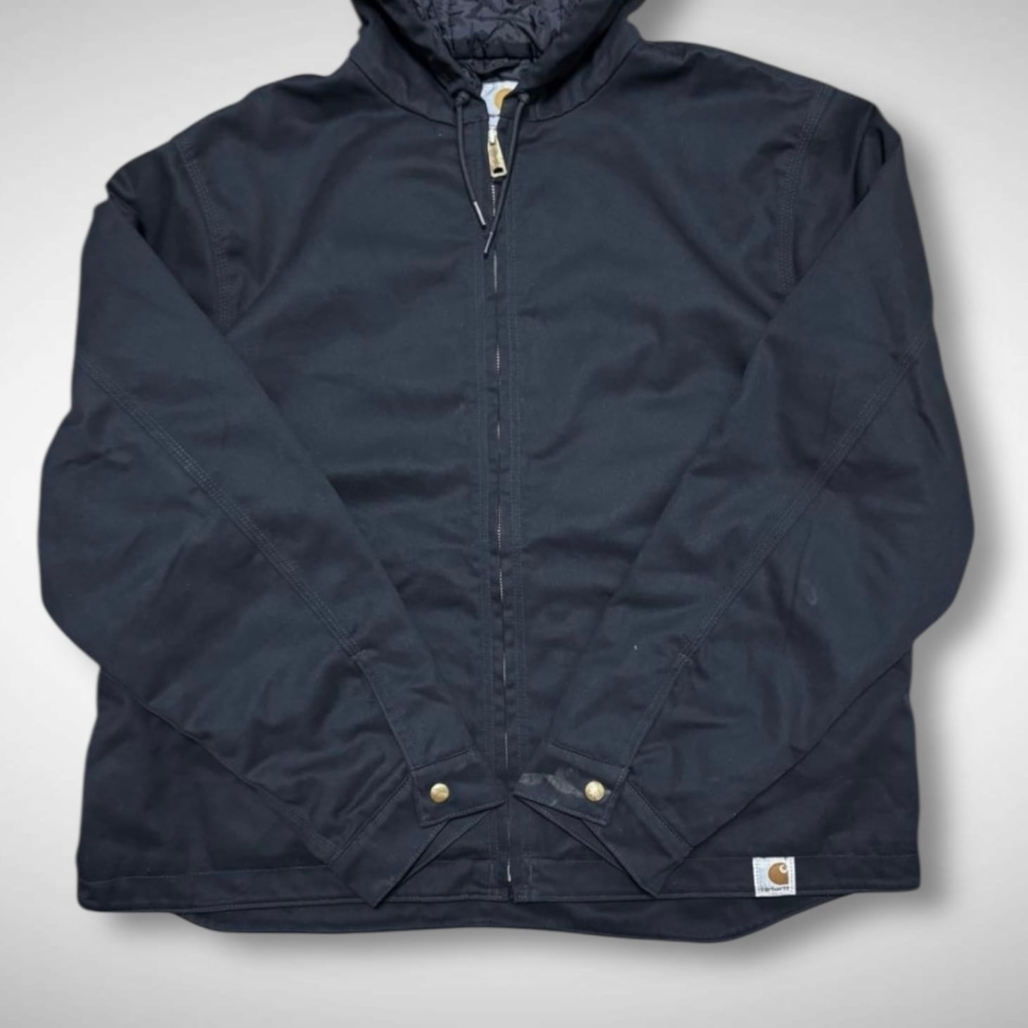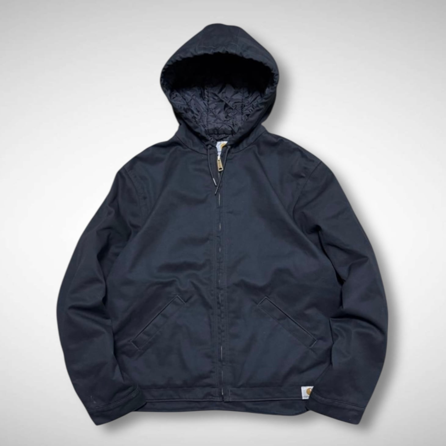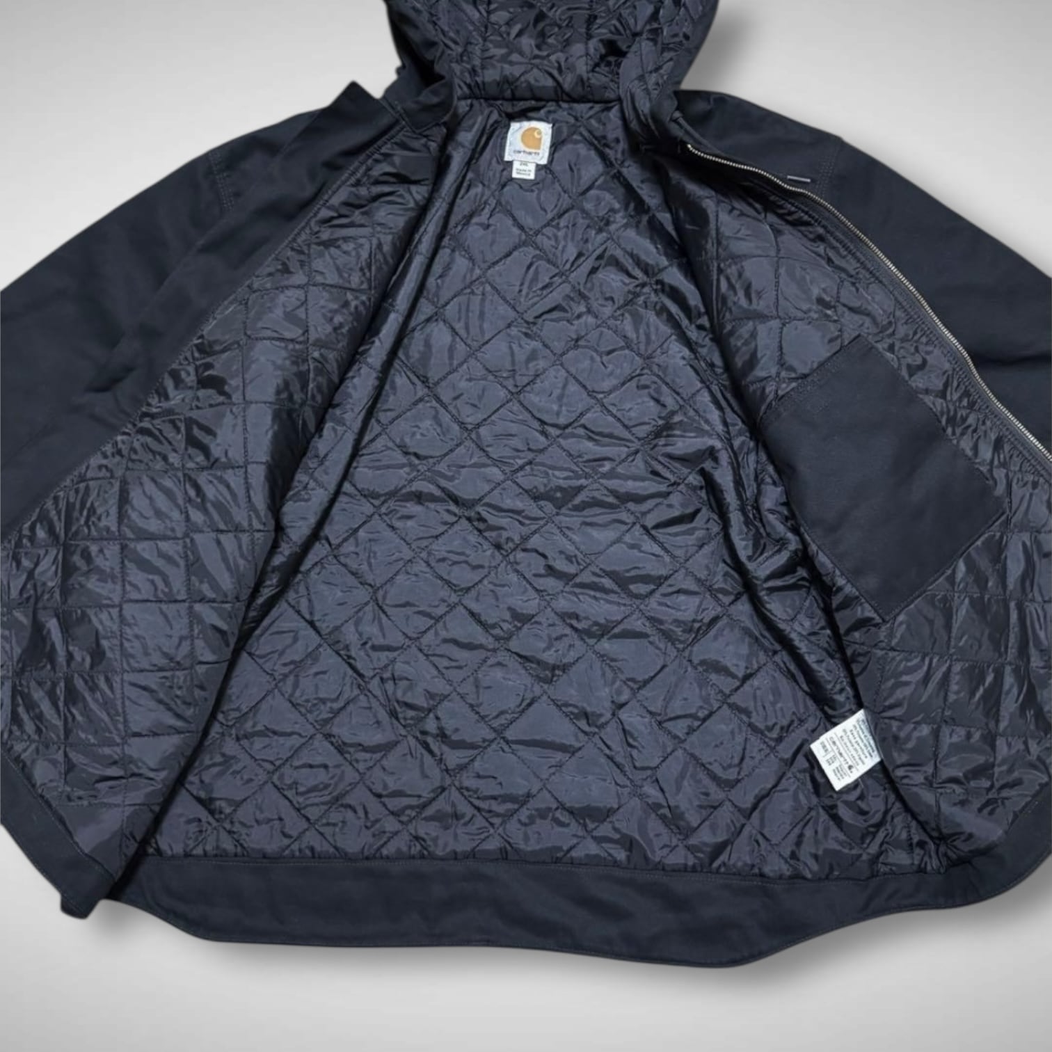 コットンツイルで作られたカーハートのブラックアクティブパーカー。裏地も薄手の中綿キルティングになるので、ダック生地だと厚くて重くて苦手な方にもおすすめのアイテムです