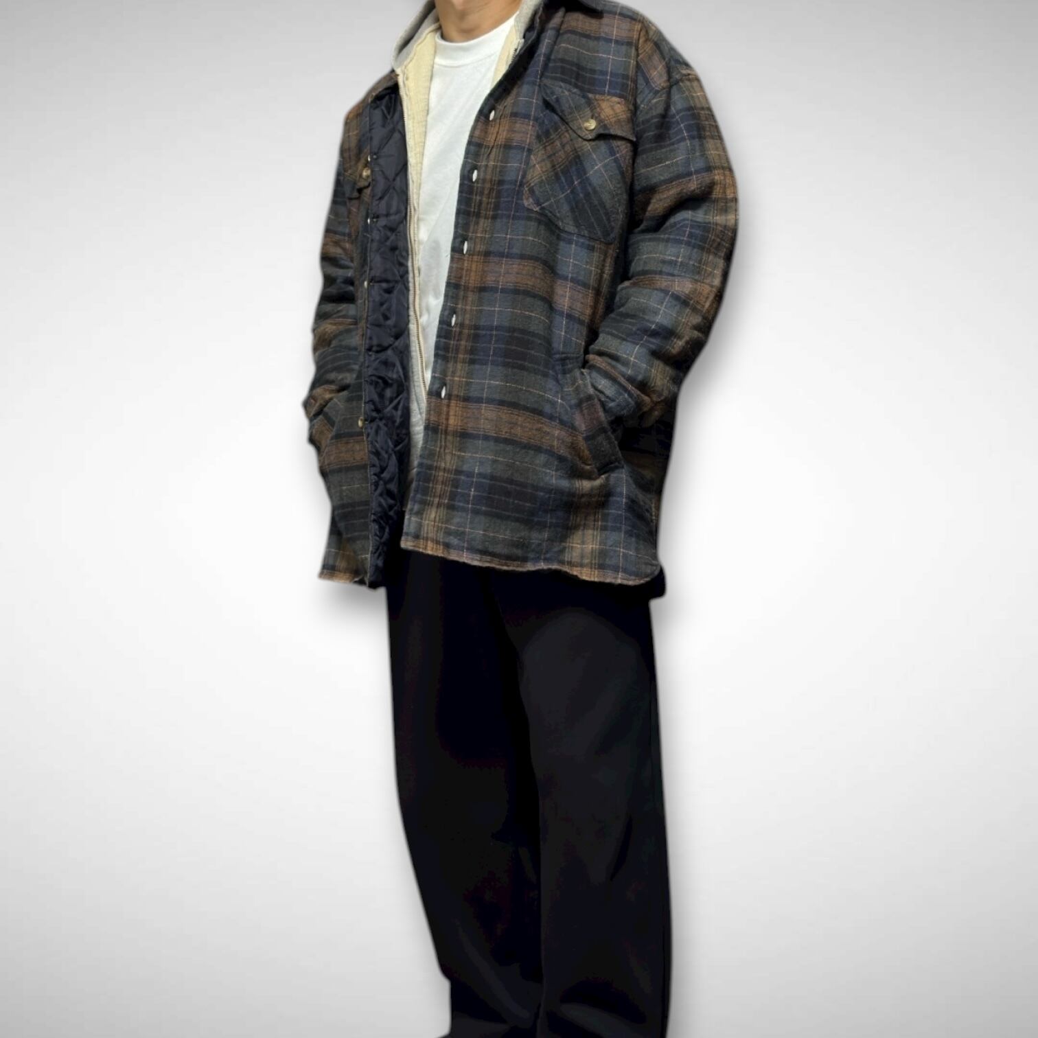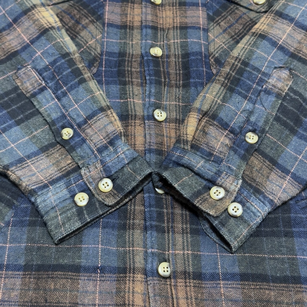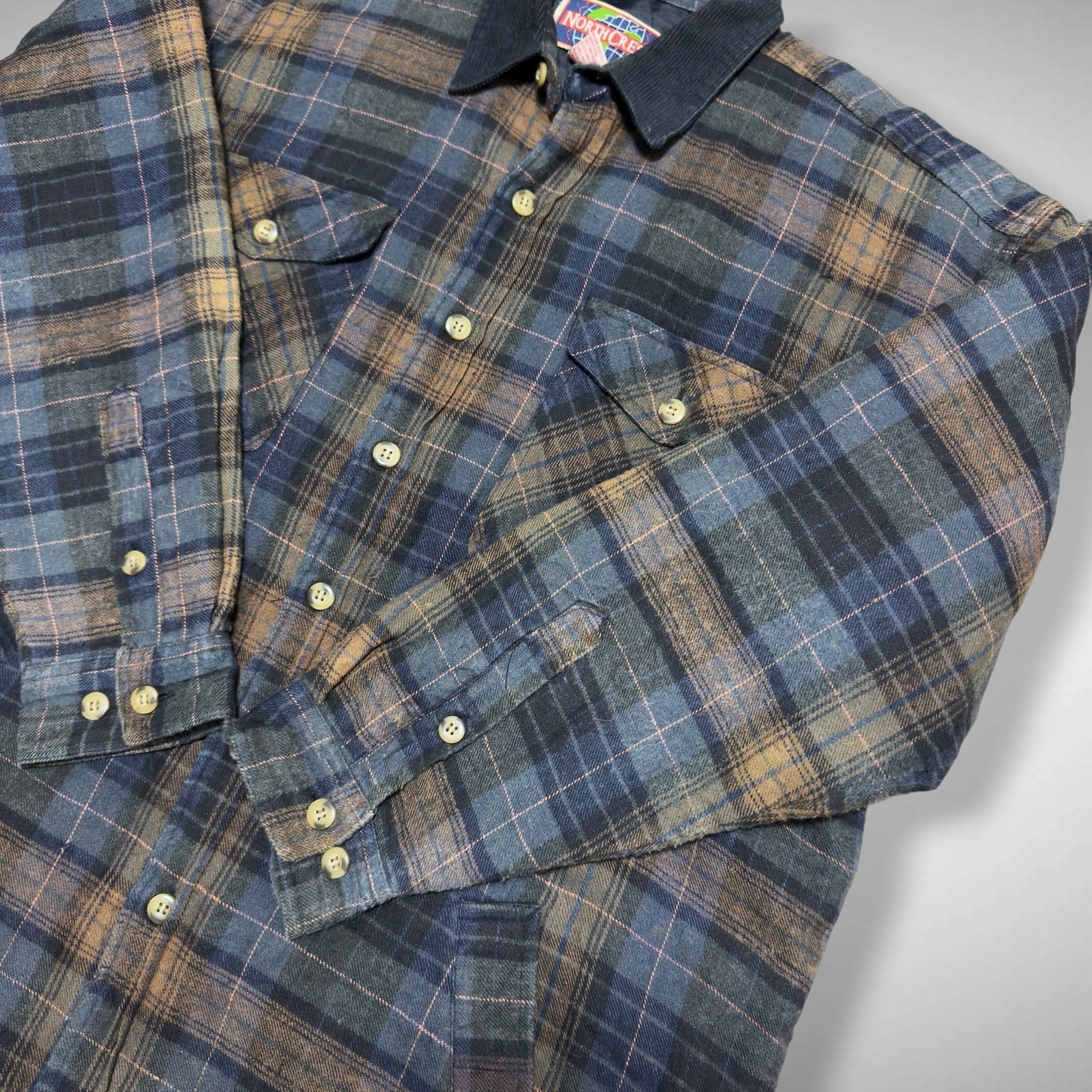 ブラウン×ネイビーをベースにピンクのストライプがはいる好配色。襟はコーデュロイの切り替えになります。