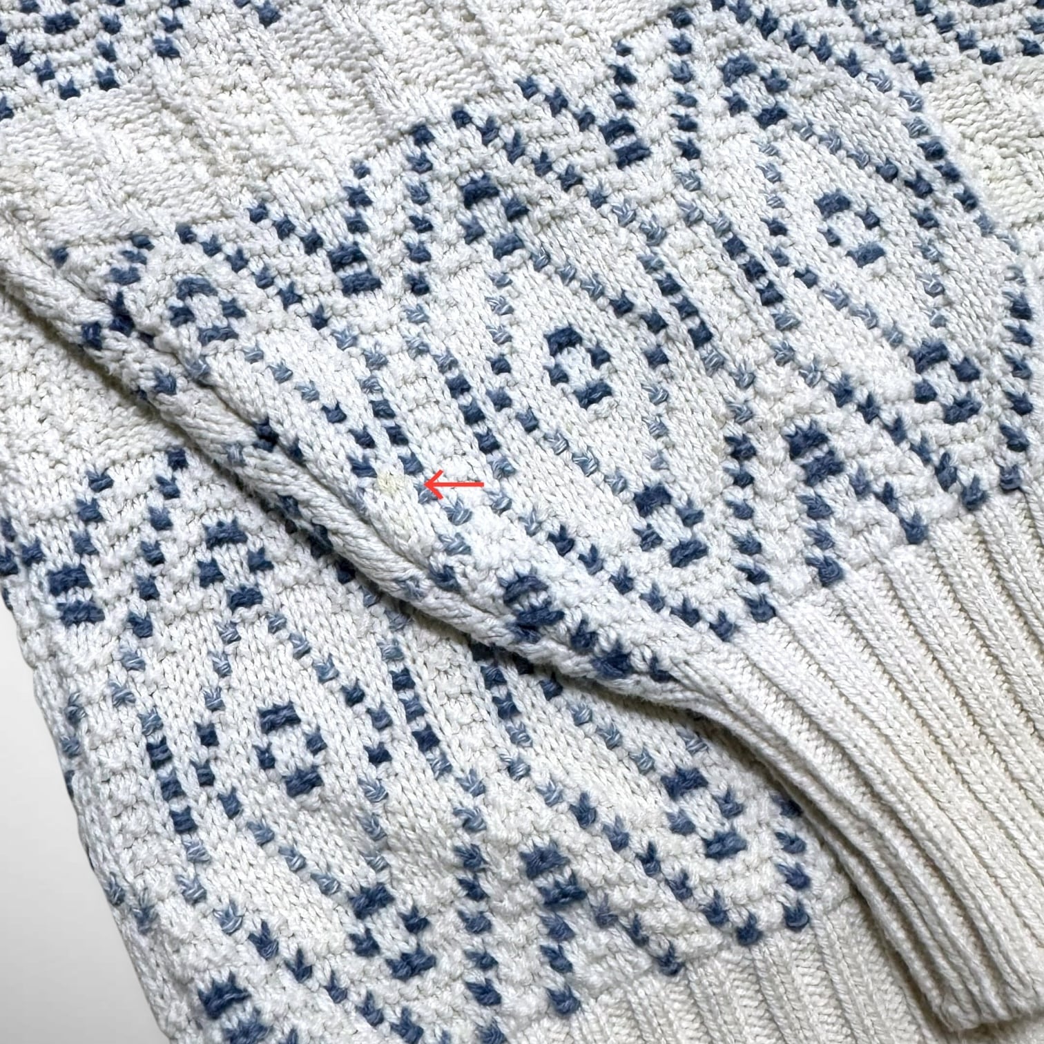 90年代アメリカ製、JANTZEN(ジャンセン)のインディゴコットンニット。ネイティブ調の幾何学模様を編み込んだ総柄デザインで、ブルー部分にはインディゴ染めの糸を使用をしています。
