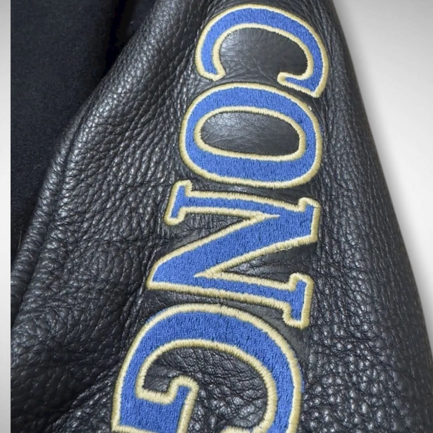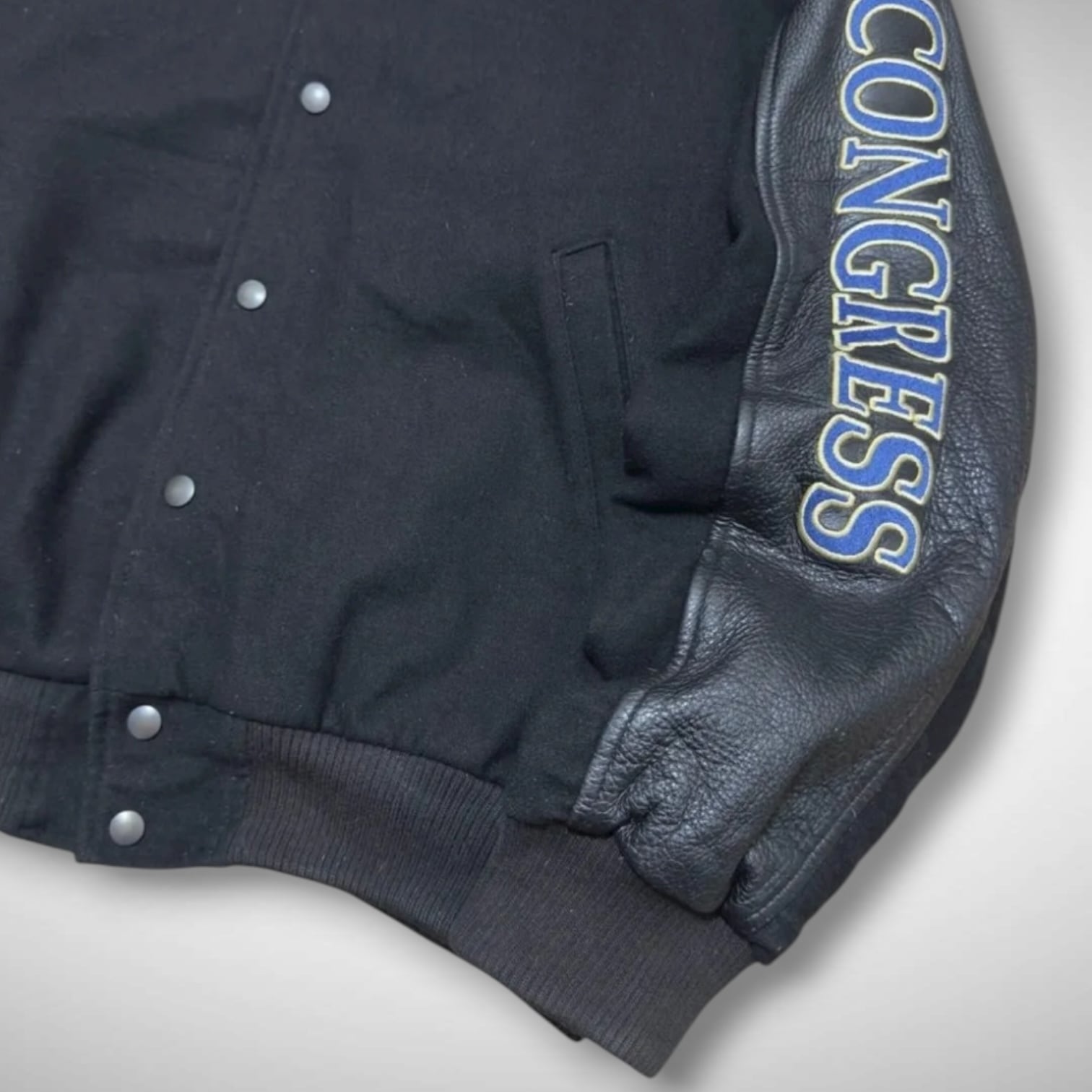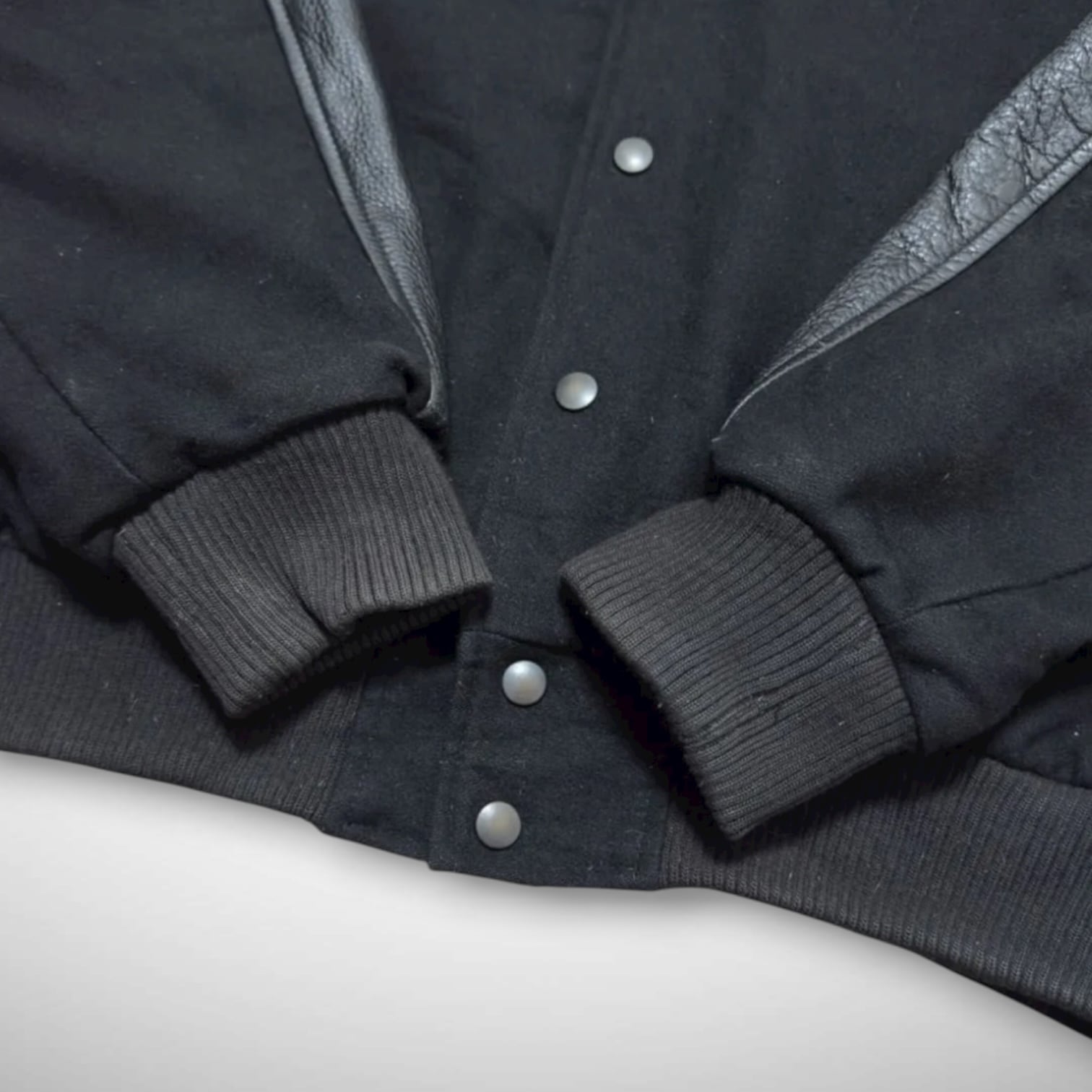 レザー&ウールのコンビ素材のヴァーシティジャケット。革質もよくウールも柔らかいので着心地は抜群。肩幅と身幅はしっかり広く、着丈の短いバランスのとれたシルエットです