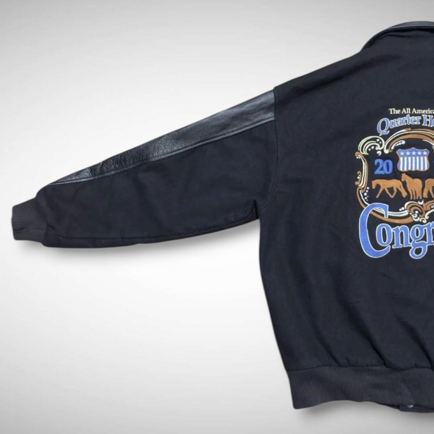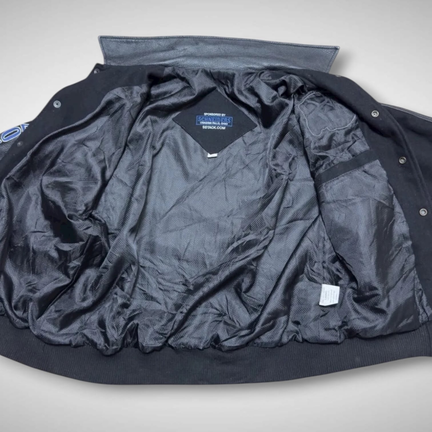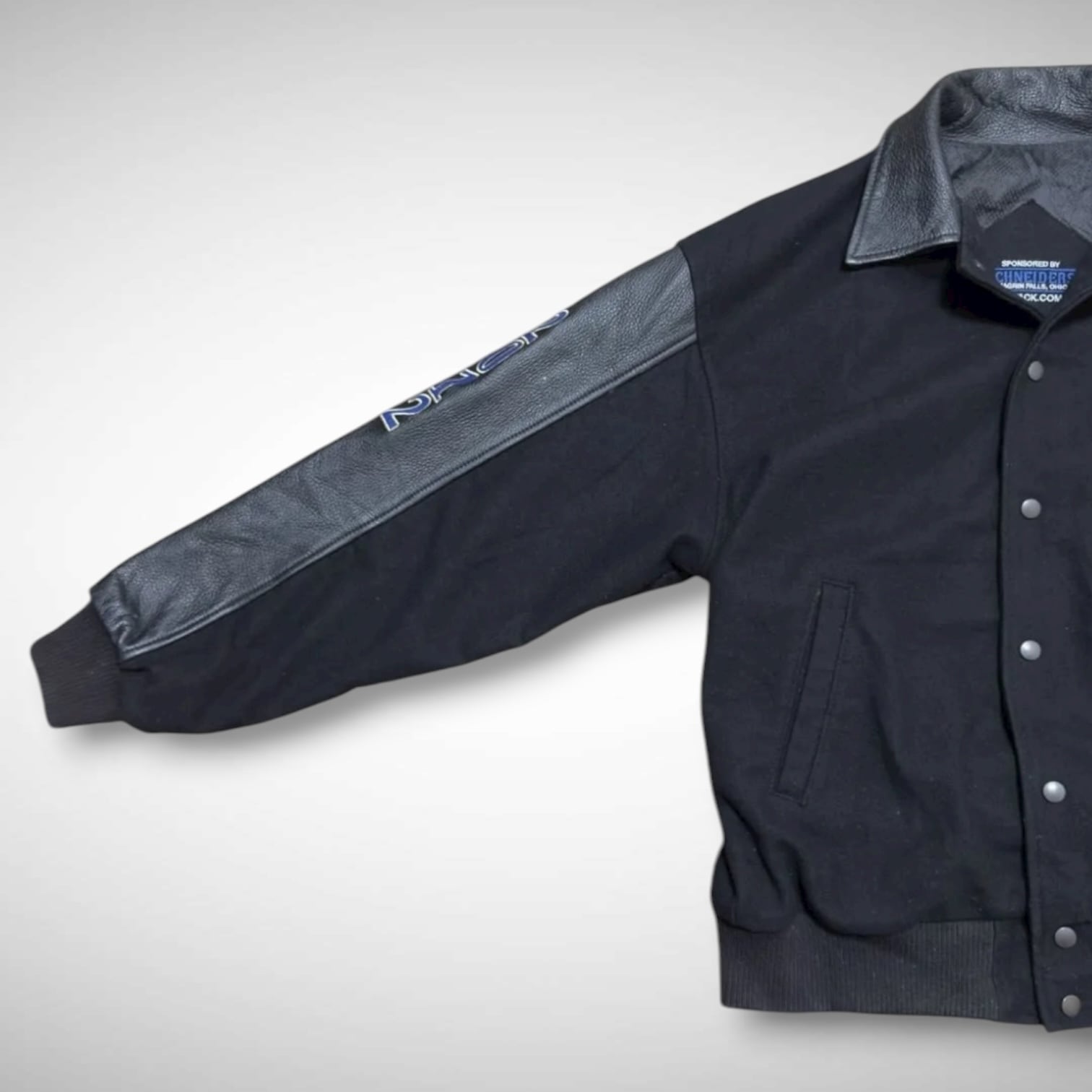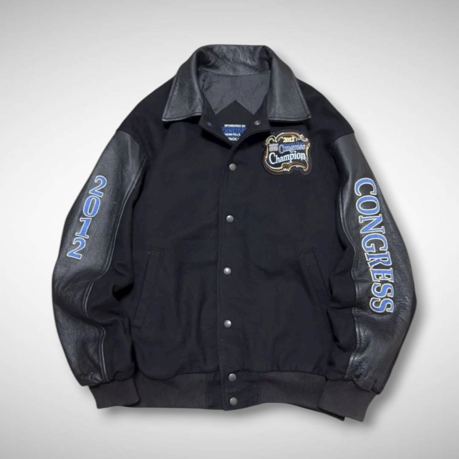レザー&ウールのコンビ素材のヴァーシティジャケット。革質もよくウールも柔らかいので着心地は抜群。肩幅と身幅はしっかり広く、着丈の短いバランスのとれたシルエットです