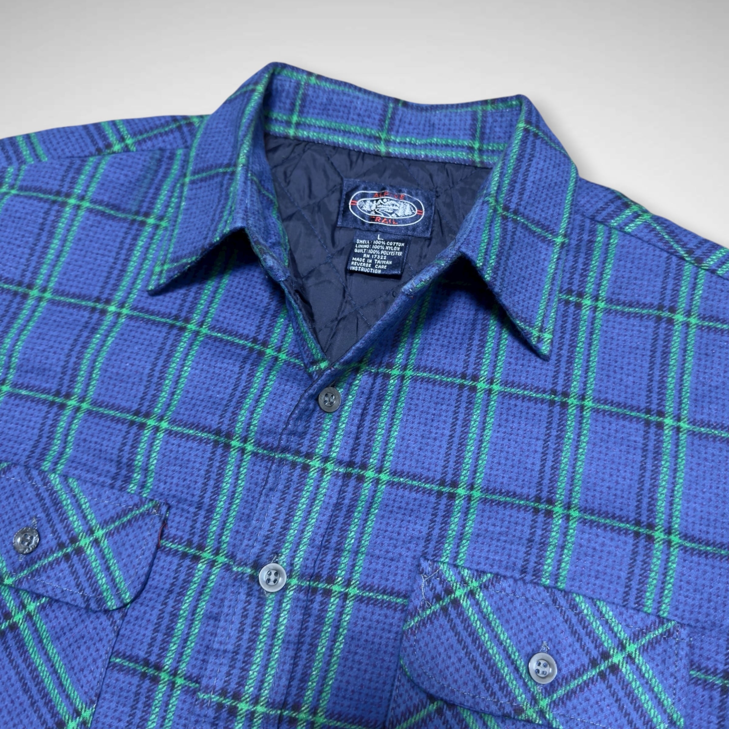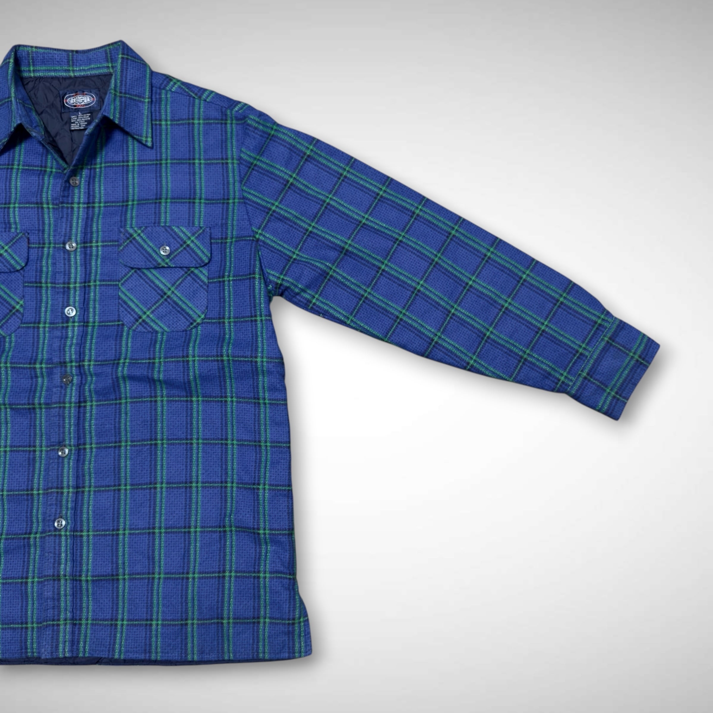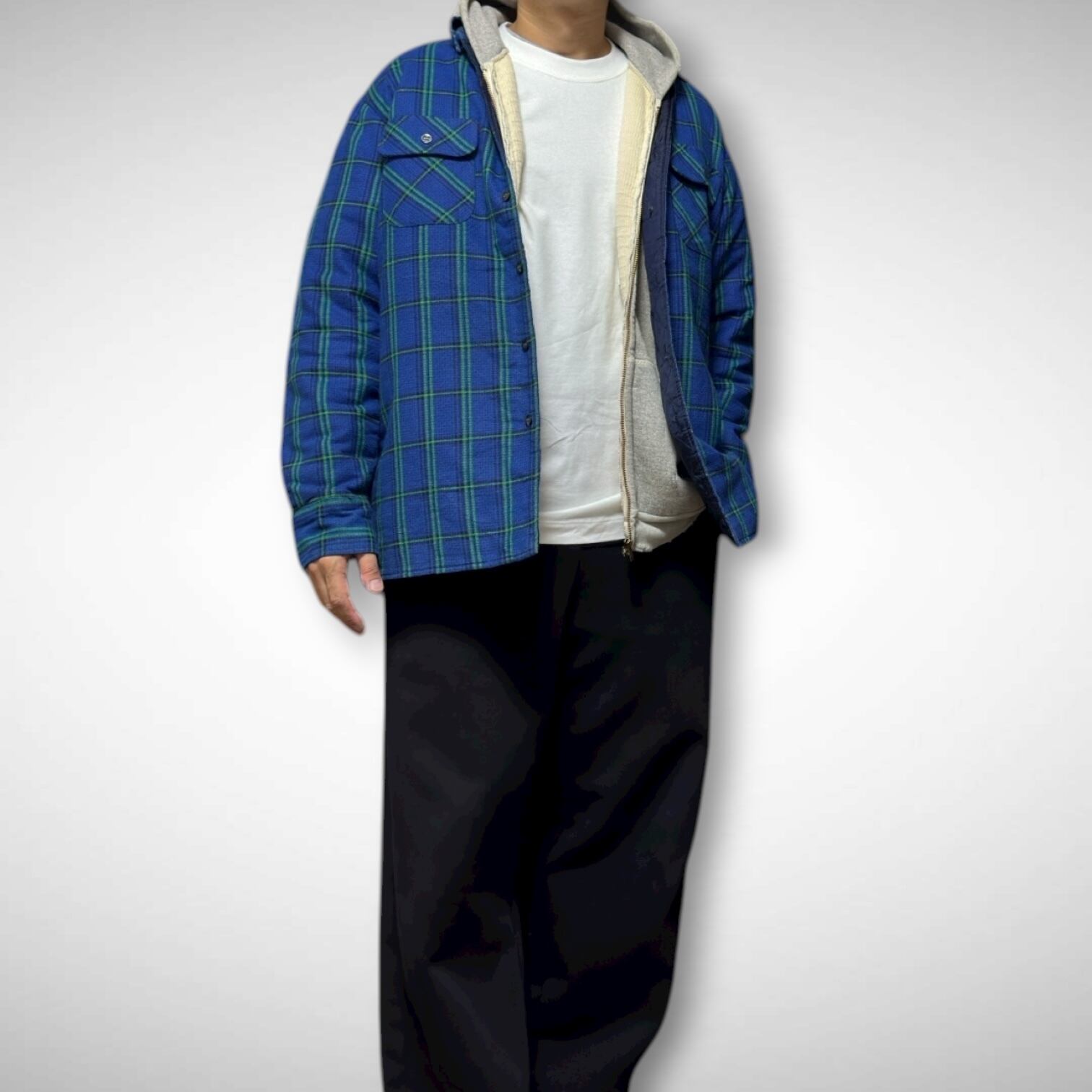 発色のいいブルーベースのカラーにグリーンがはいったチェック柄。薄手のキルティングなので、中にパーカーをいれてあげてライトアウター感覚でも着用できます。