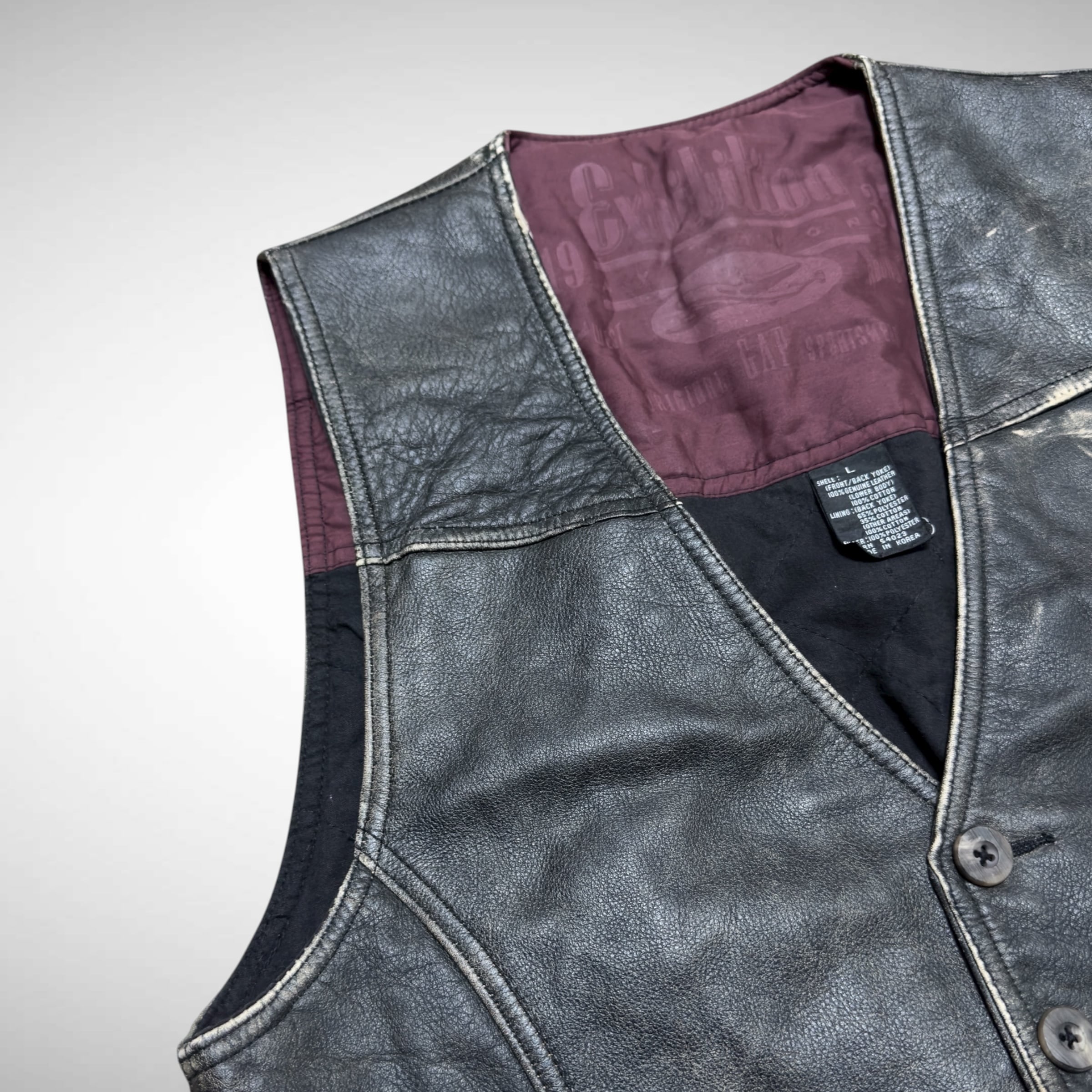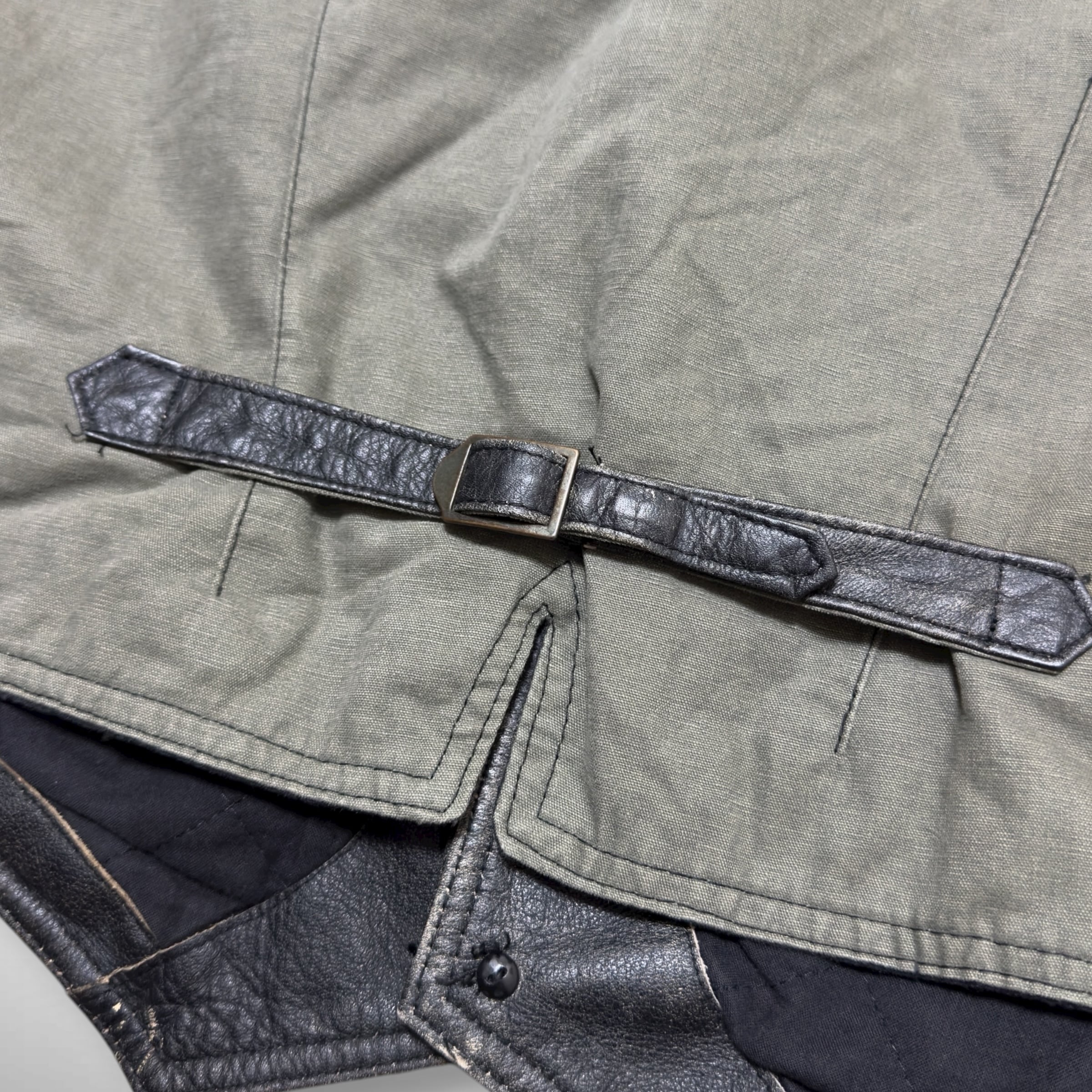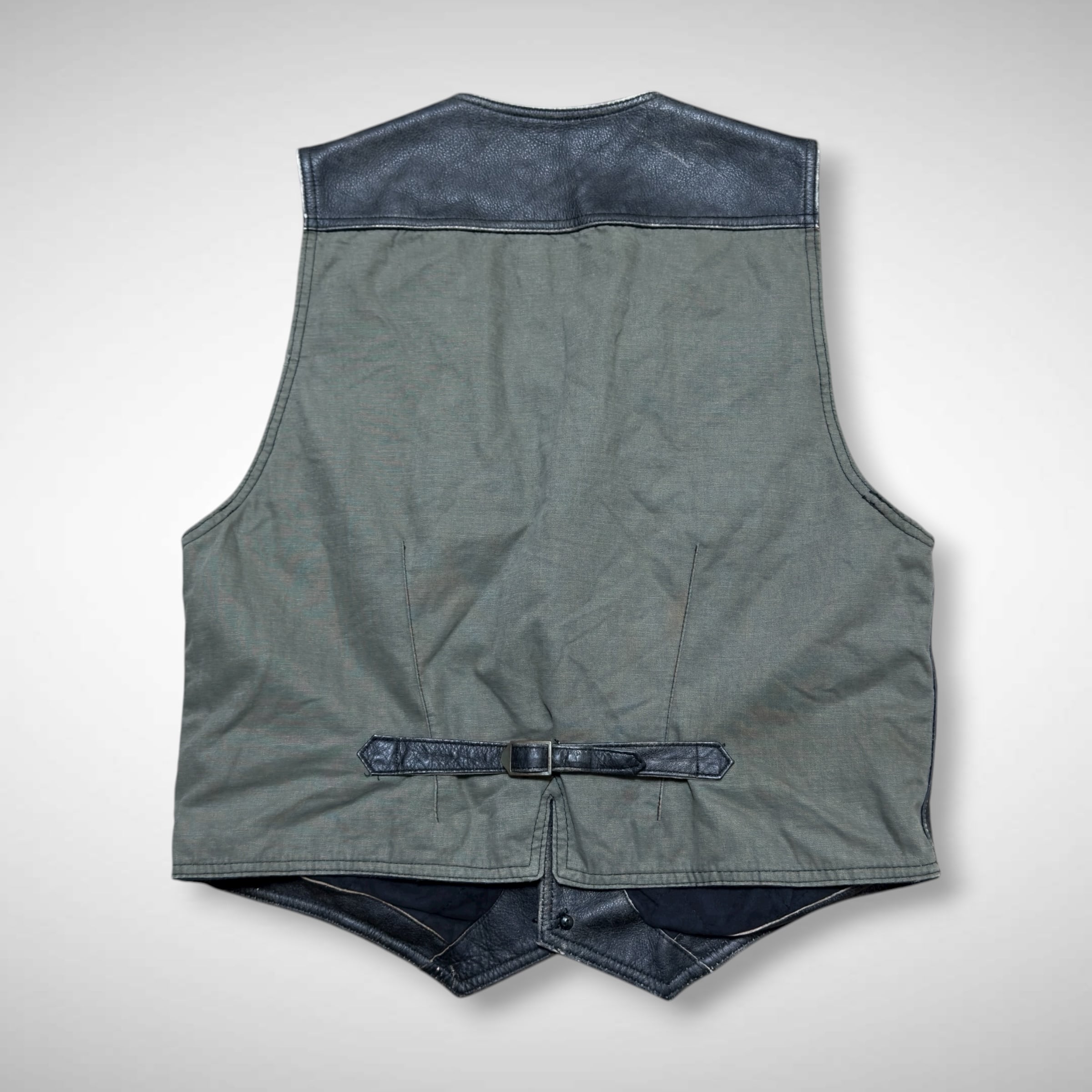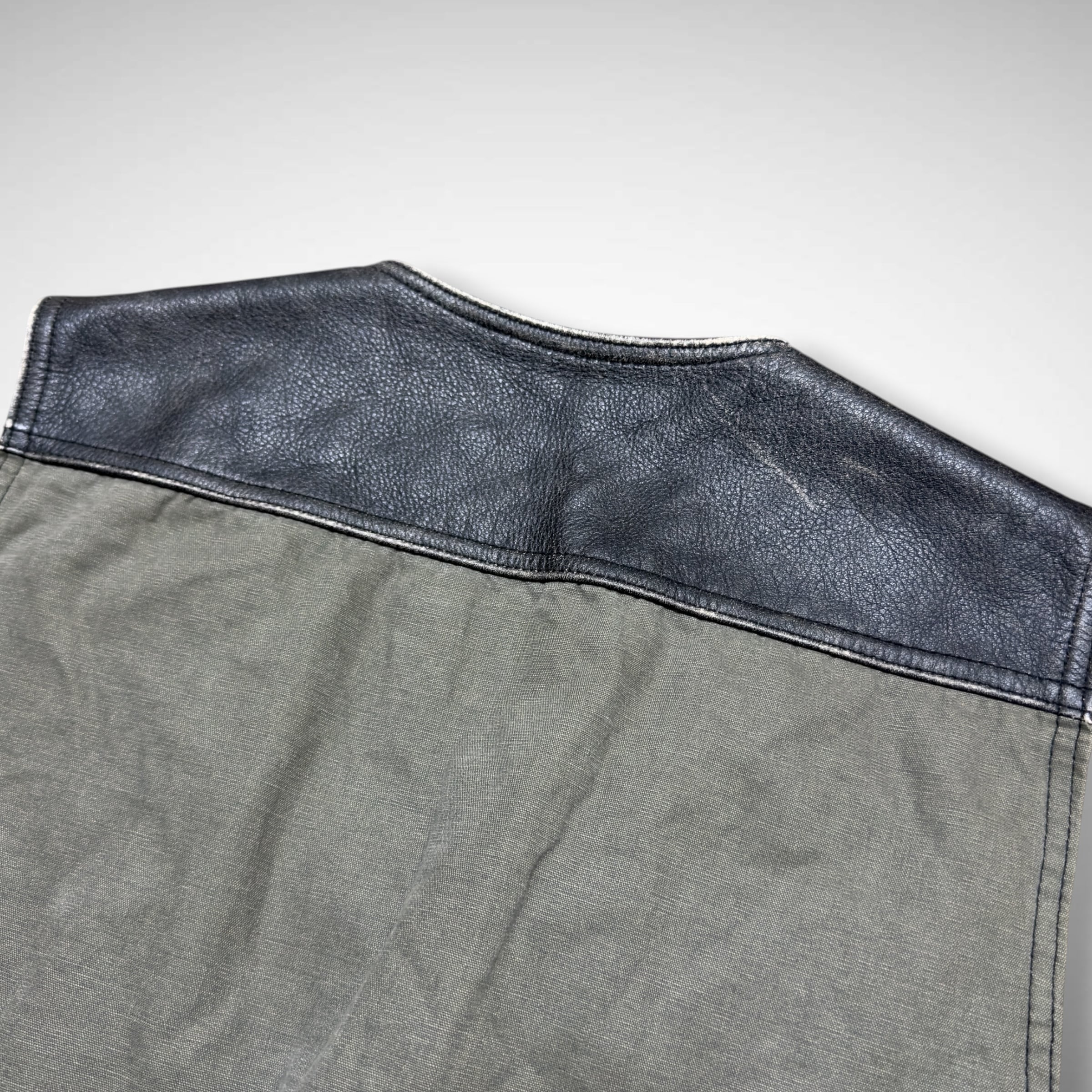 90s後半から00s初頭にかけてのオールドギャップの本革レザーベスト。フロントとヨーク部分に本革を使用し、ボディはオリーブカラーのコットン素材で切り替えられたデザインになります。