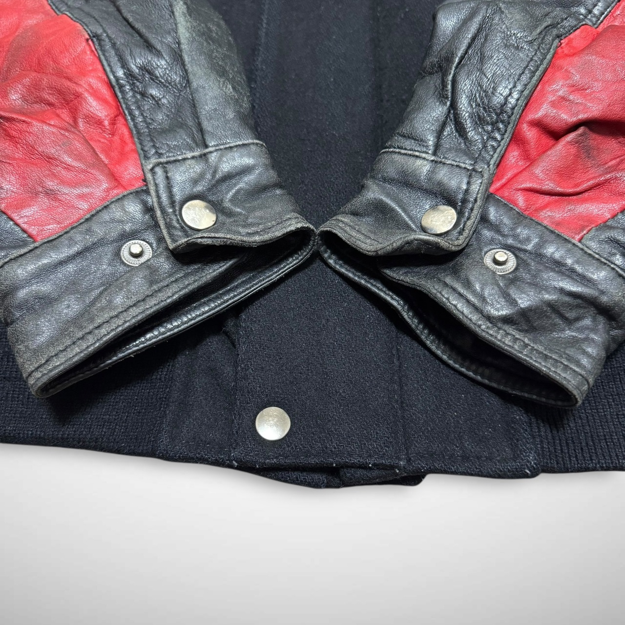 ボディは上質なウール生地、襟と袖は本革レザーの切り替え仕様。ブラックをベースに、ポケット部分や襟袖の一部に赤のレザーが使われています。