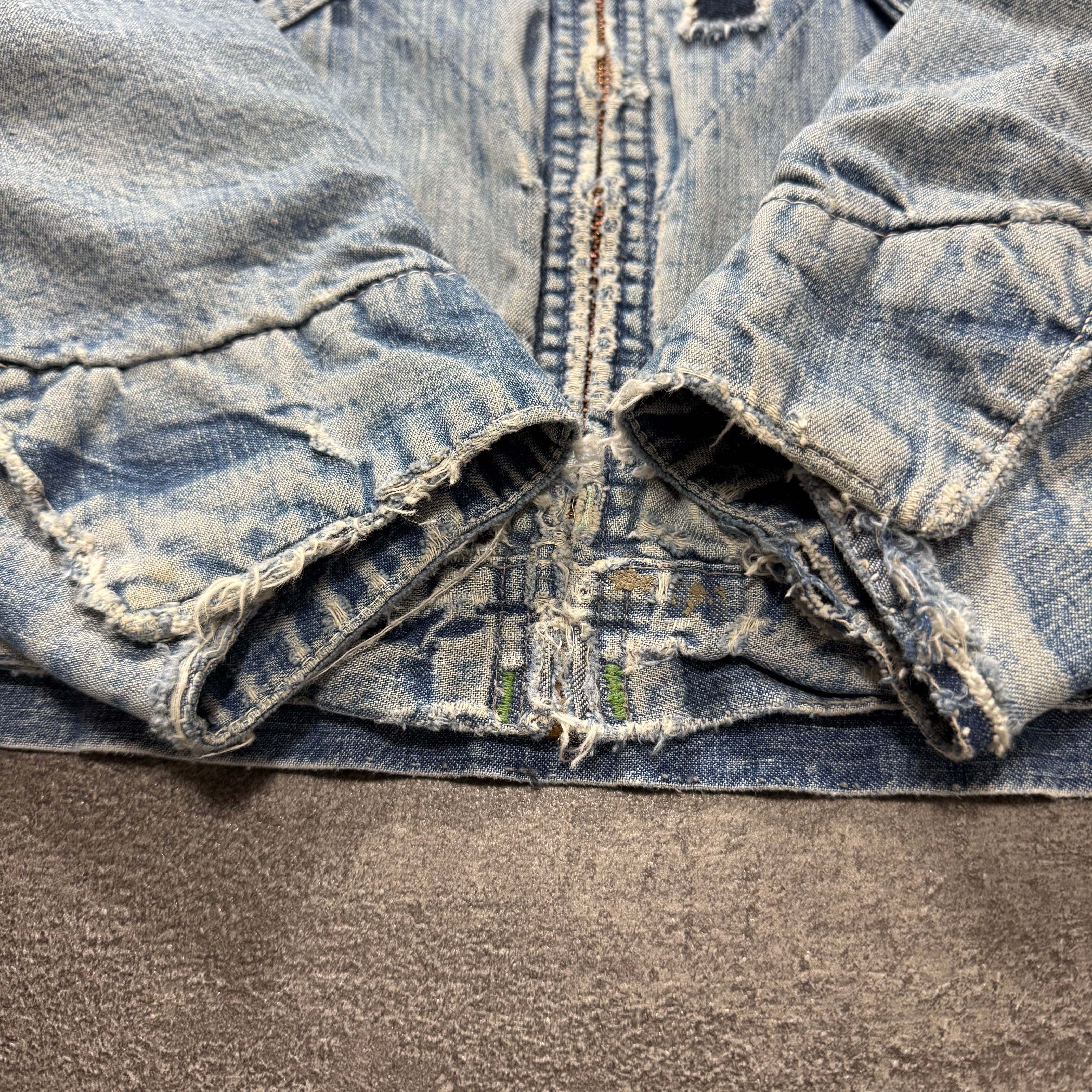 襟コーズの褪色、当て布リペア、裏地の千鳥格子が見えるようにダメージが入ひ、どの角度から見ても完全にアートピースな個体