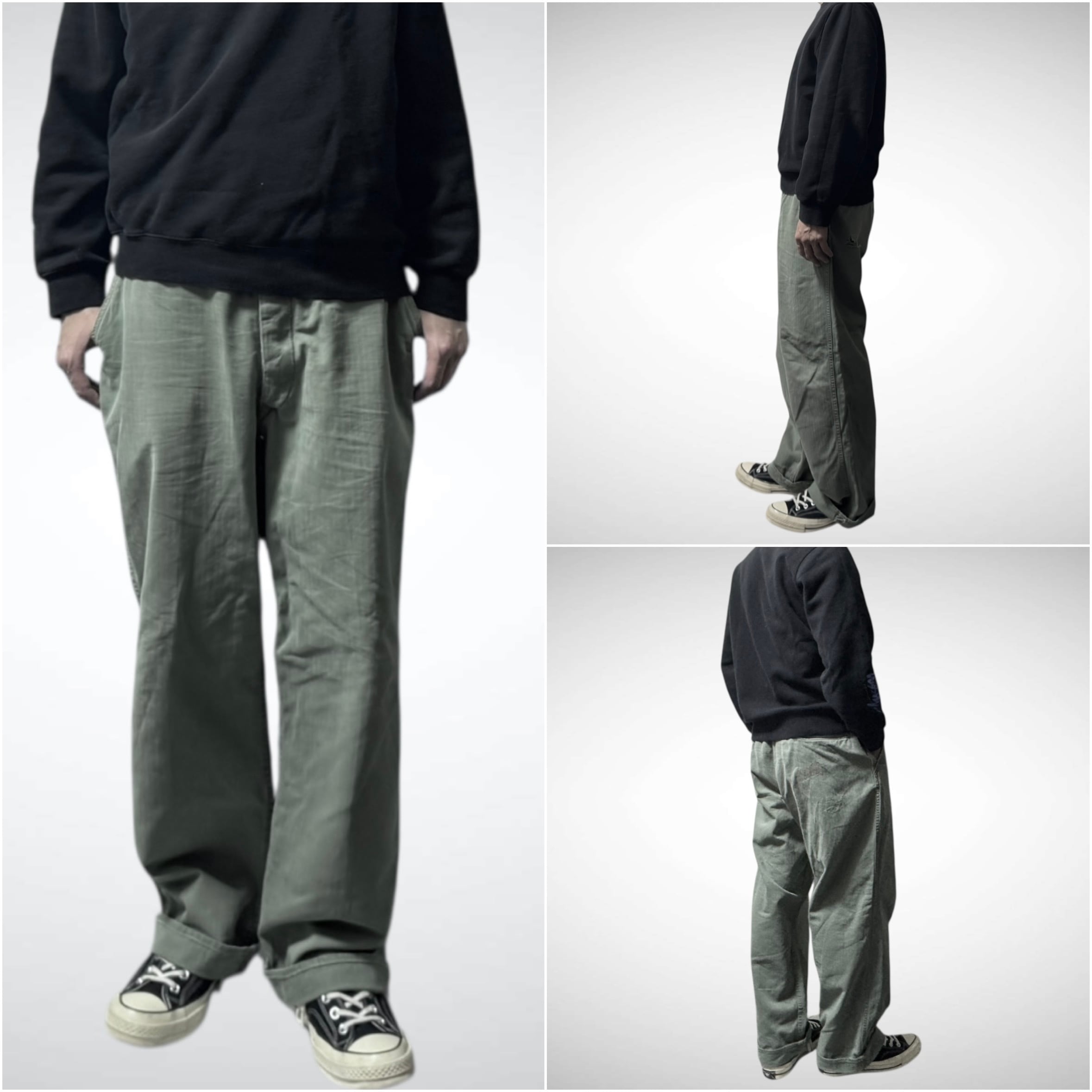 シルエットはストン落ちる太めのスラックスのようなワイドストレート。雑なリペアが雰囲気あって◎です。