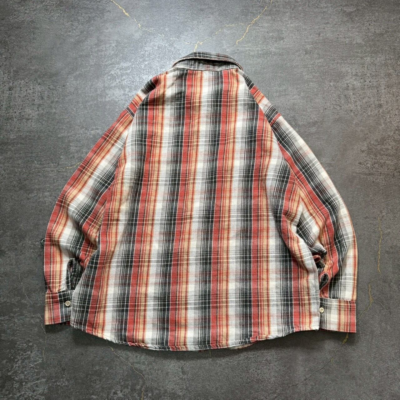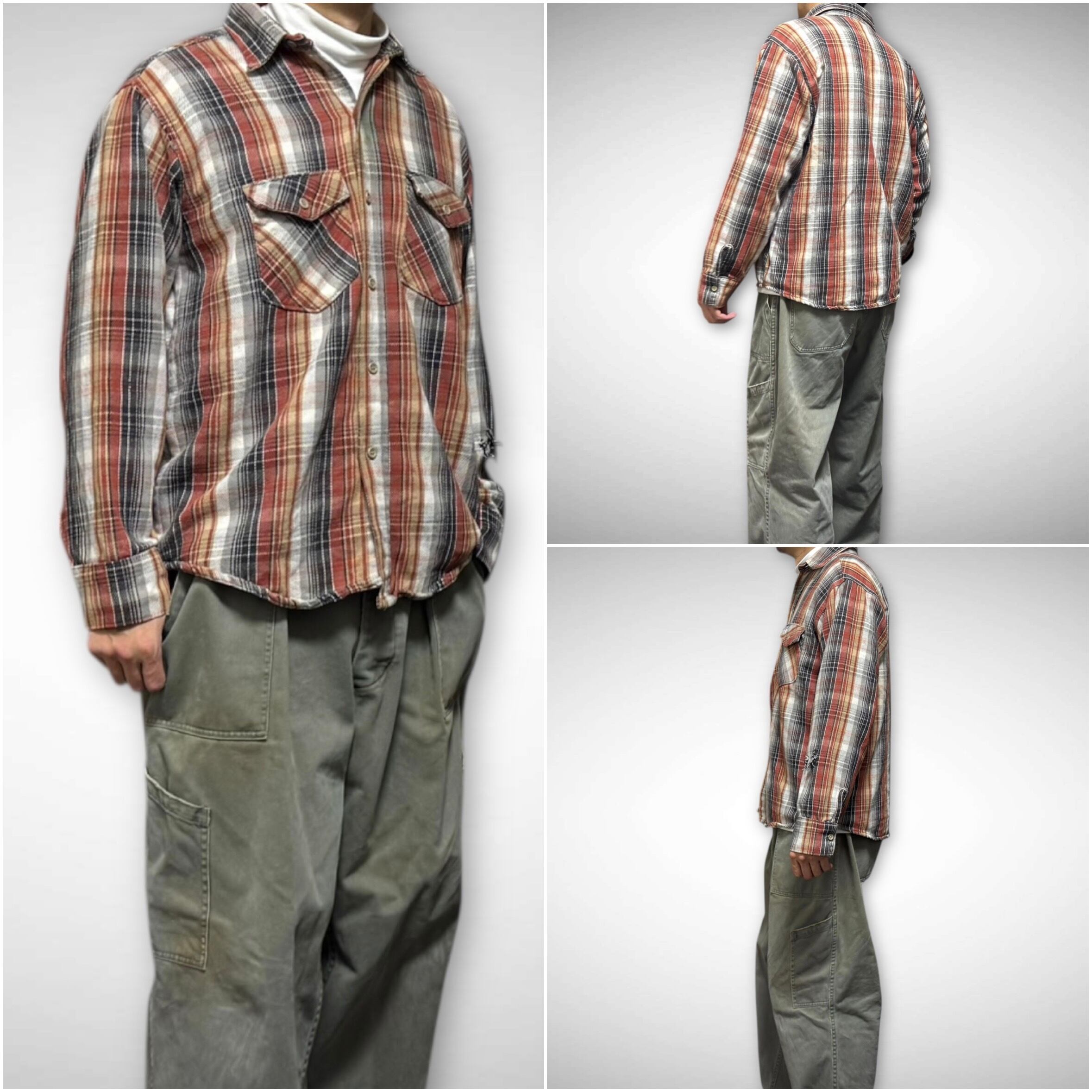ブラックグレー×オレンジのグラデーションチェックが最高な配色な一枚。袖に入ったダメージもアジのある雰囲気に仕上がっています。