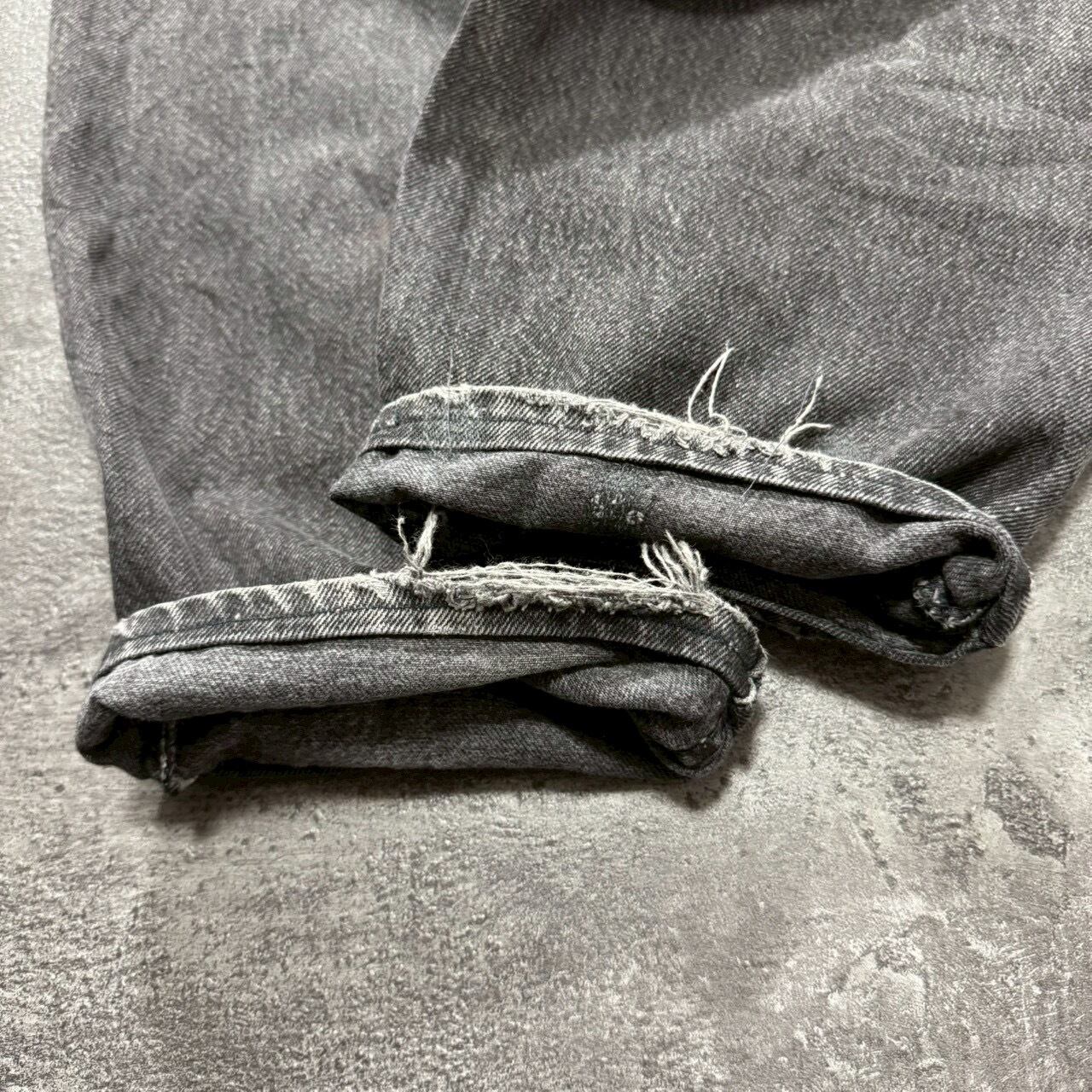 このあたりの品番ではめずらしいメリハリのある色落ちの後染めブラックデニム。サイズもW38×L29の極太ゴールデンサイズです。このサイズになると裾幅も細くないので、シルエットも抜群にいいのもポイント。ベルトでギュンギュンに絞って履いてください!