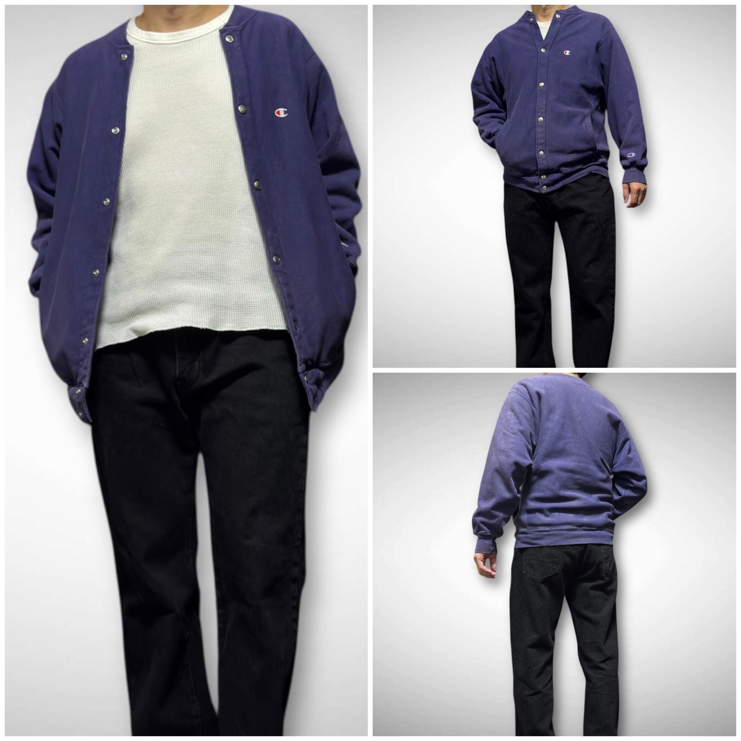 ナス紺カラーの目あり無地スナップカーディガン。普通のリバースよりスナップは大きめなのでこのMがゴールデンサイズになります