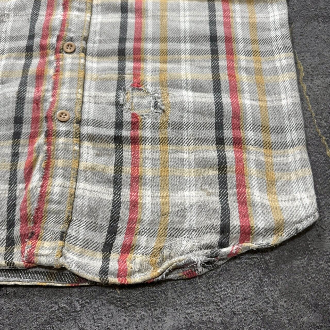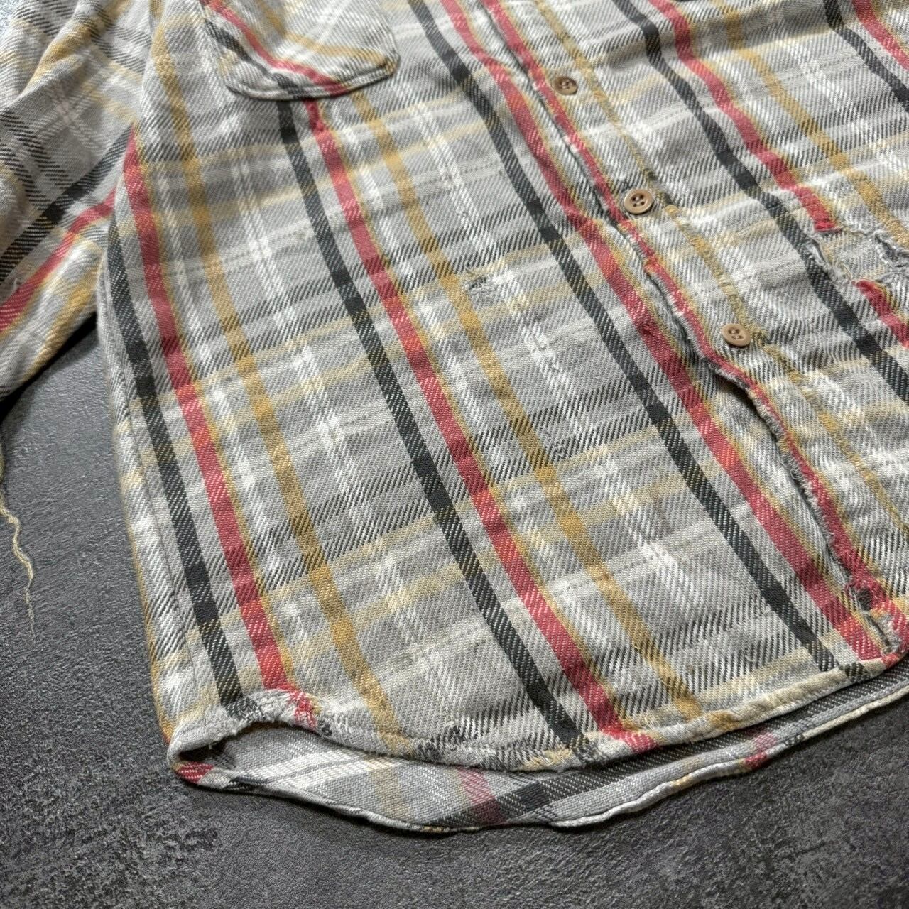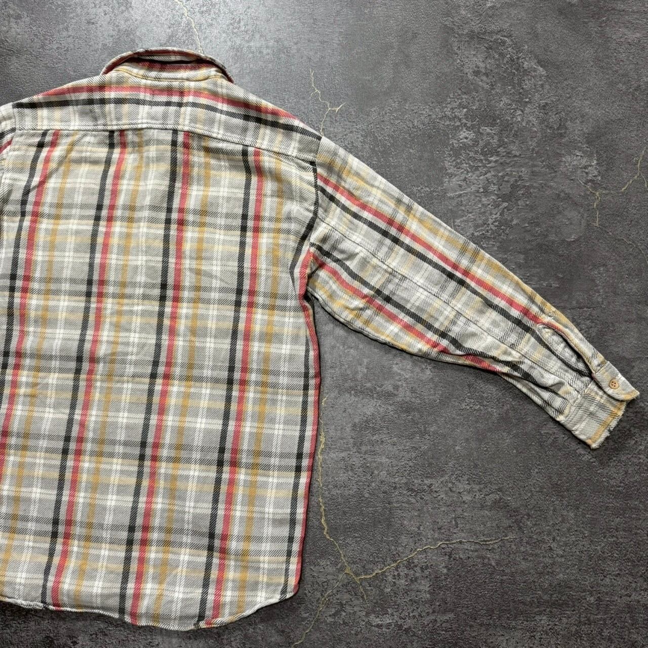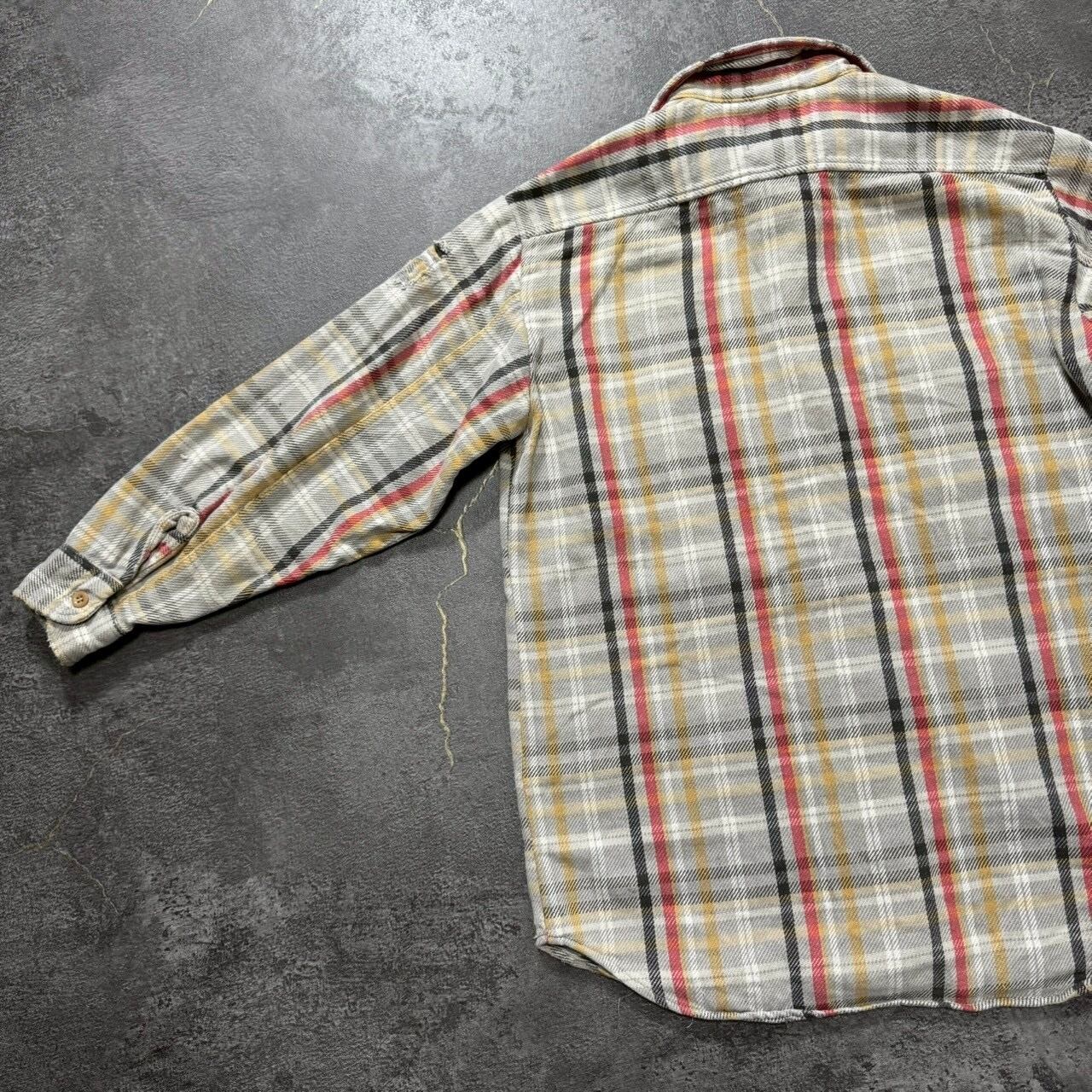 グレーベースのチェックに、マスタードとブラッドオレンジが差し色で入る最高の配色。同じ年代の同じネルシャツから生地を取ってリペアが施された贅沢なボロの個体です
