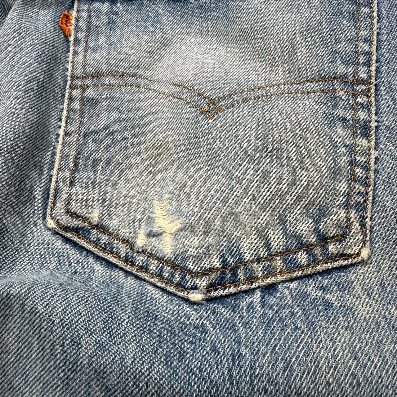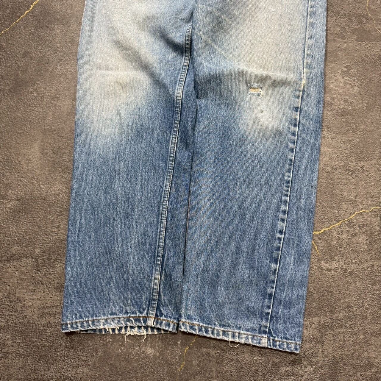 もも、右バックポケット、裾にダメージがありますが、色落ち具合もよく雰囲気のいい個体です。古着慣れされてる方であれば問題なく着用できる状態です。リペアはなく、股の生地も薄くなっていません。