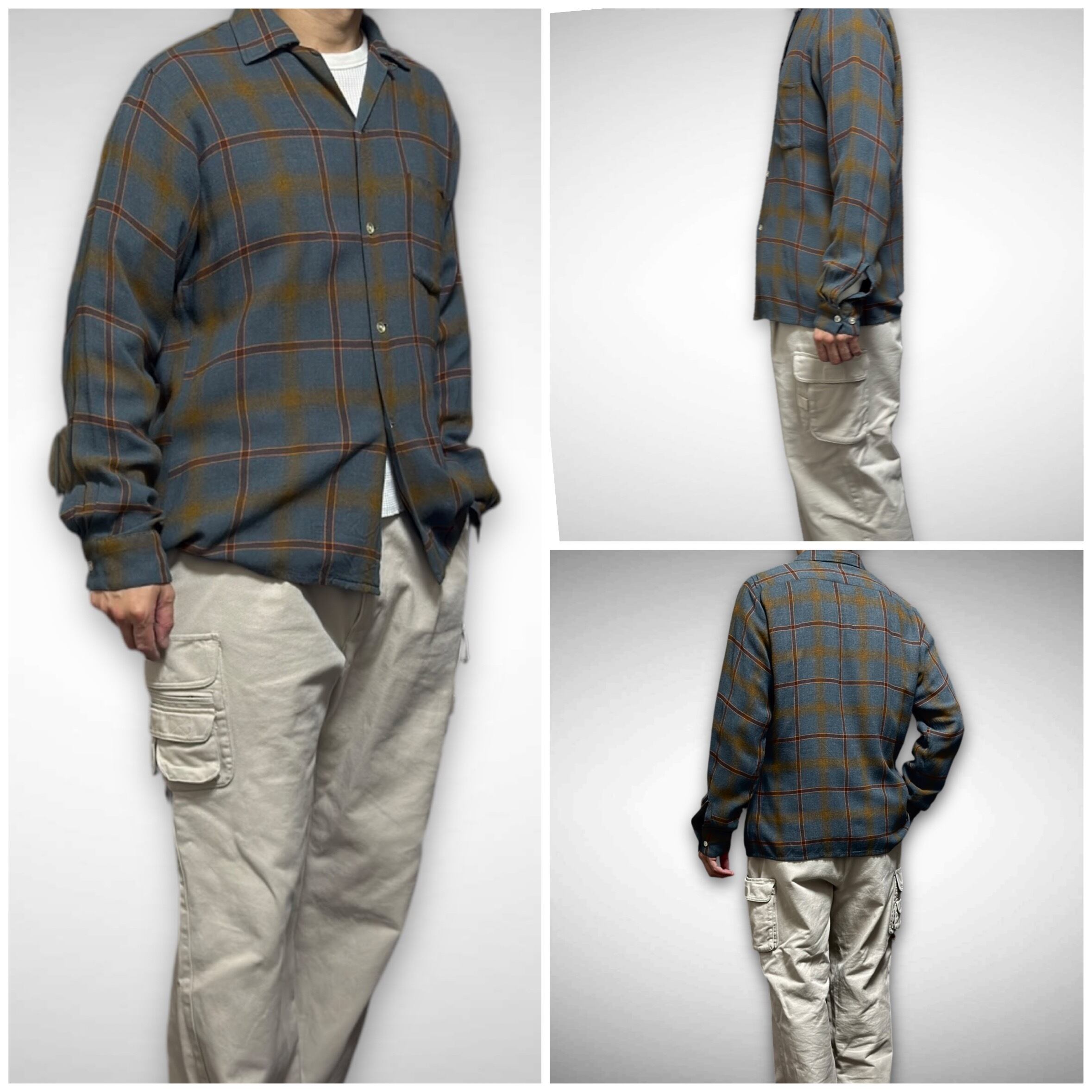 よくあるチェック柄ではなく、青とグレーを混ぜたような色味に、オレンジとマスタードカラーがアクセントになっている見かけないカラーデザイン。胸ポケットとボディの柄がしっかり合った手の込んだ一枚です
