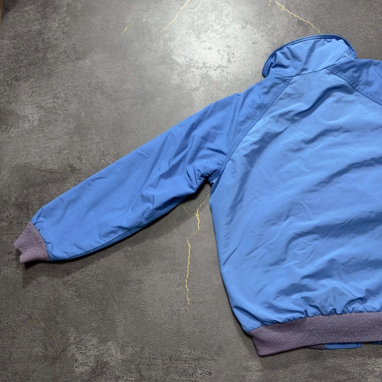 褪色したリブとややくすんだブルーのボディがオールドアウトドアらしい雰囲気で◎。希少なSサイズでコンパクトに着れるサイズ感です。