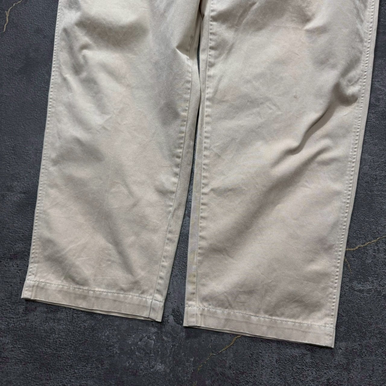 カラーは軍物チノパンでもお馴染みのカーキ(温かみのあるベージュ)で、褪せた経年変化が雰囲気のある個体です。この風合いやフェードも染料、綿糸の質、織り方によって生み出されるこの時期のモデルならではのものになります