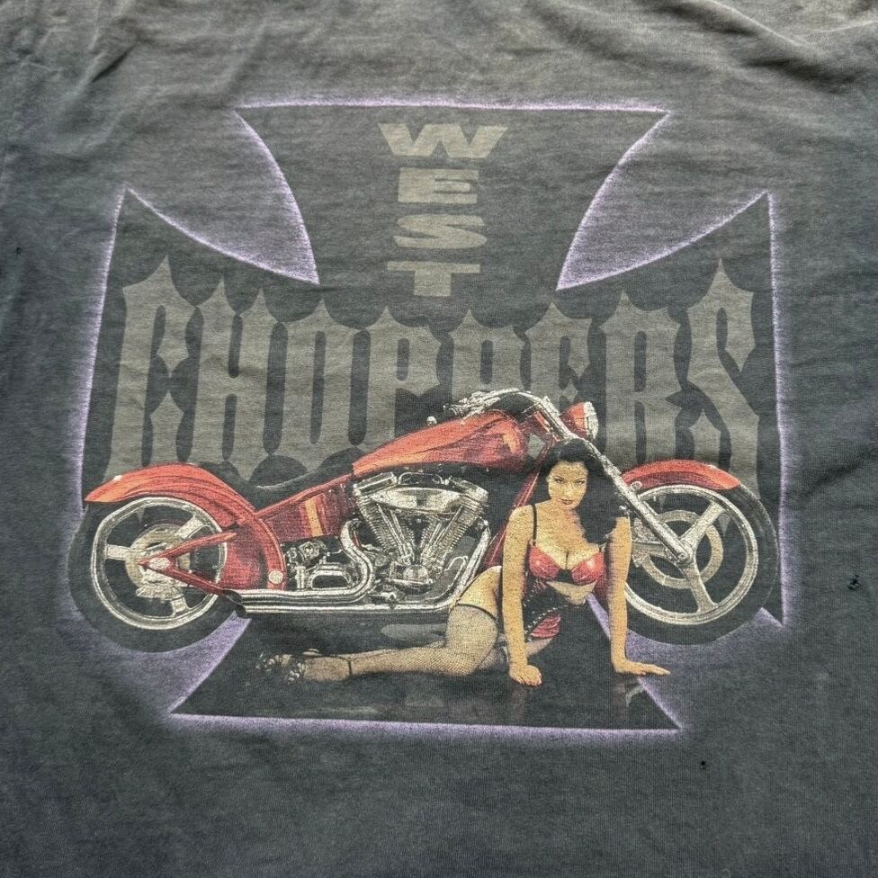 WEST COAST CHOPPERSのグラフィックTシャツ。アイアンクロス×チョッパー×ピンナップガールのデザインがフルに落とし込まれた一枚です